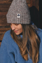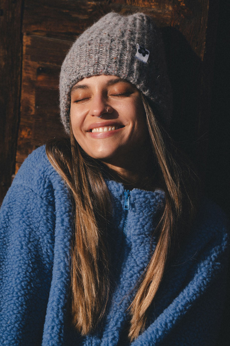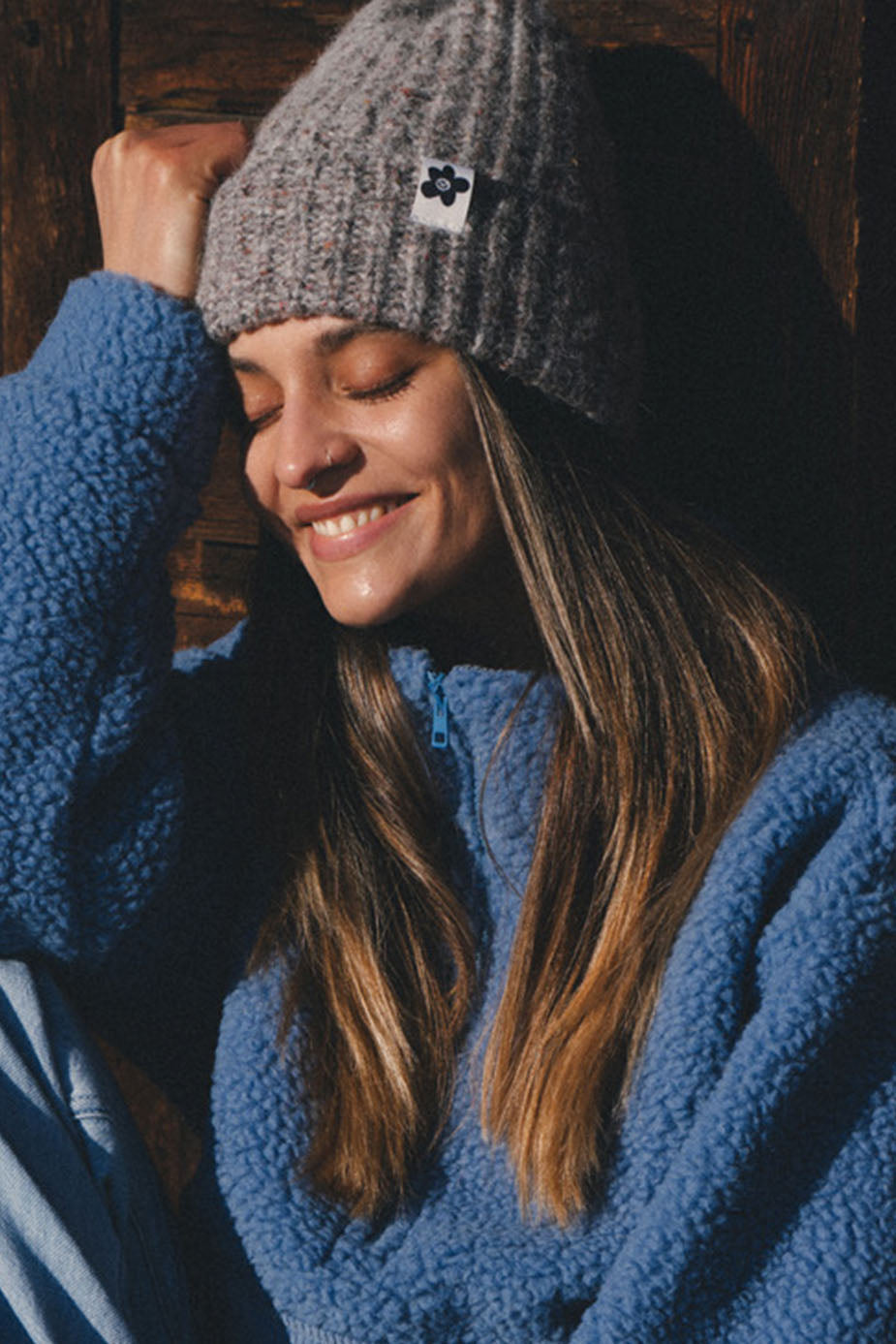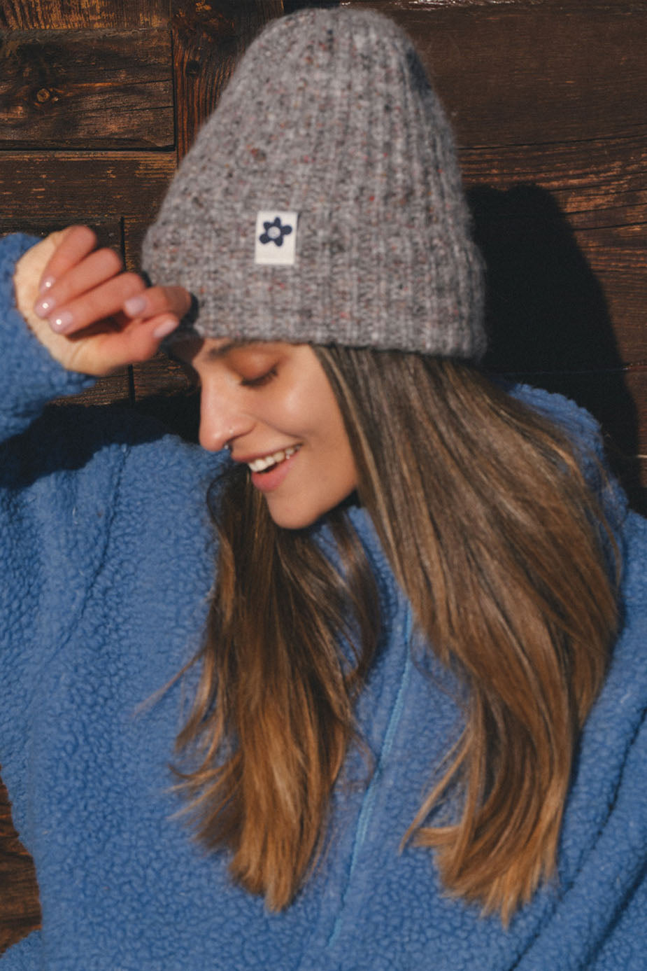 Puszysta, miękka melanżowa czapka z wełny alpaki. Szary kolor włóczki z czerwono-pomarańczowymi drobinkami idealnie uzupełni stylizację i zadba abyście nie zmarźli. Czapka jest bardzo mięciutka i nie uciska. Jej wygląd uzupełnia naszywką z kwiatkiem.