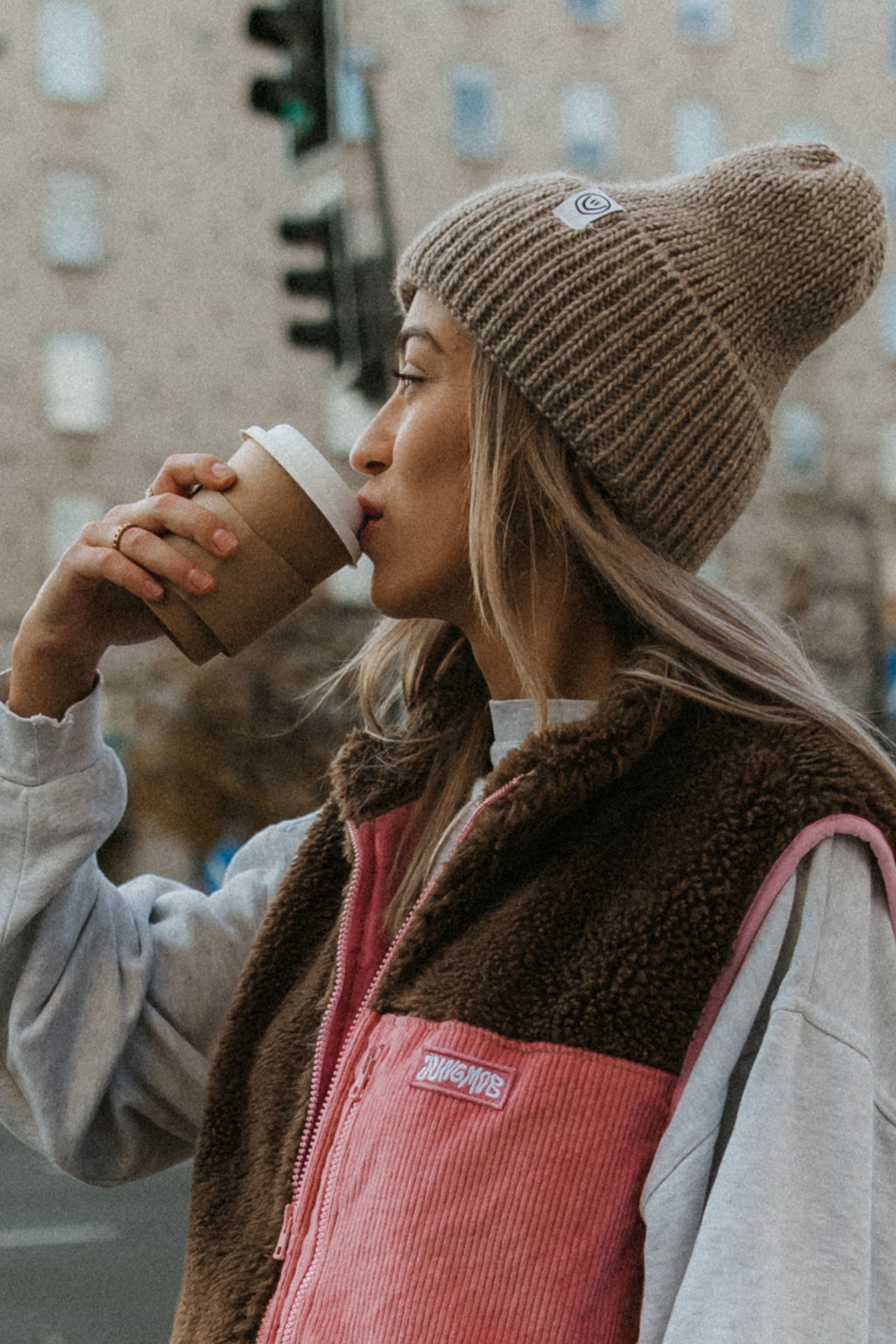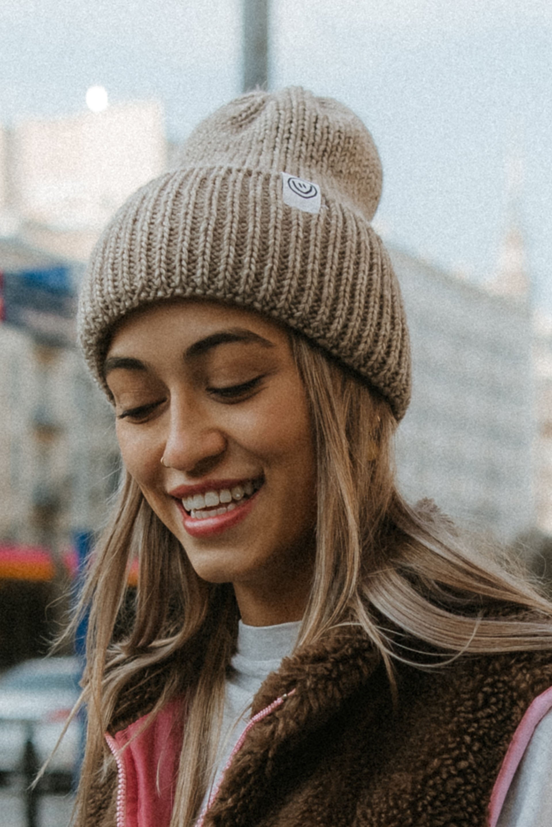 Czaka Cloud w kolorze złamanego ciemnego beżu, lekko wpadającego w brąz. Z dodatkiem nowej naszywki - smile :) Możliwość wywinięcia czapki jak na zdjęciu, lub noszenie w wersji dłuższej nie podwiniętej.