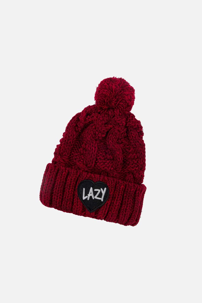 Bardzo ciepła, wywijana czapka dziana z pomponem w wersji dziecięcej. Idealna na sezon jesień-zima. Na przodzie naszywka "LAZY".