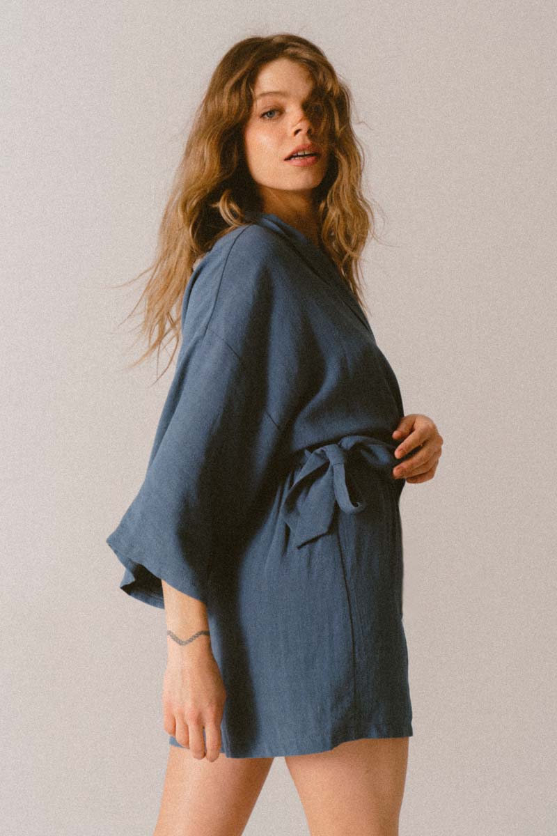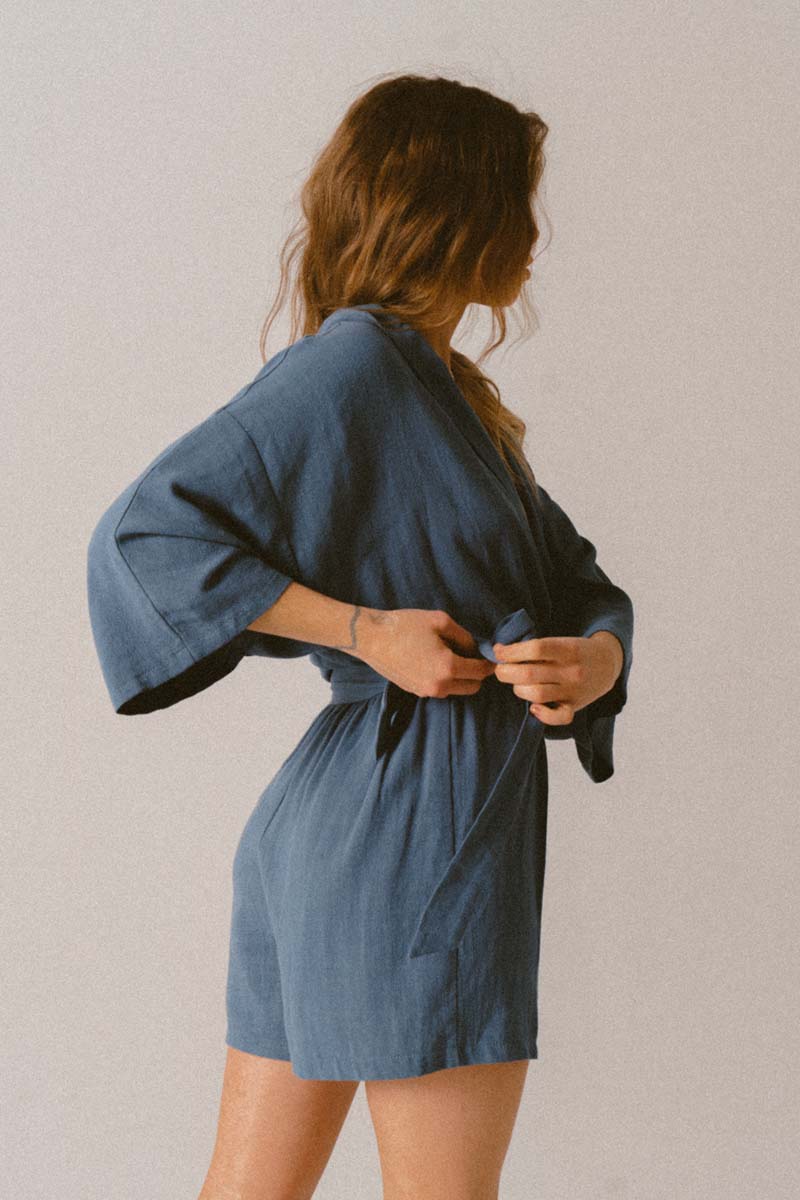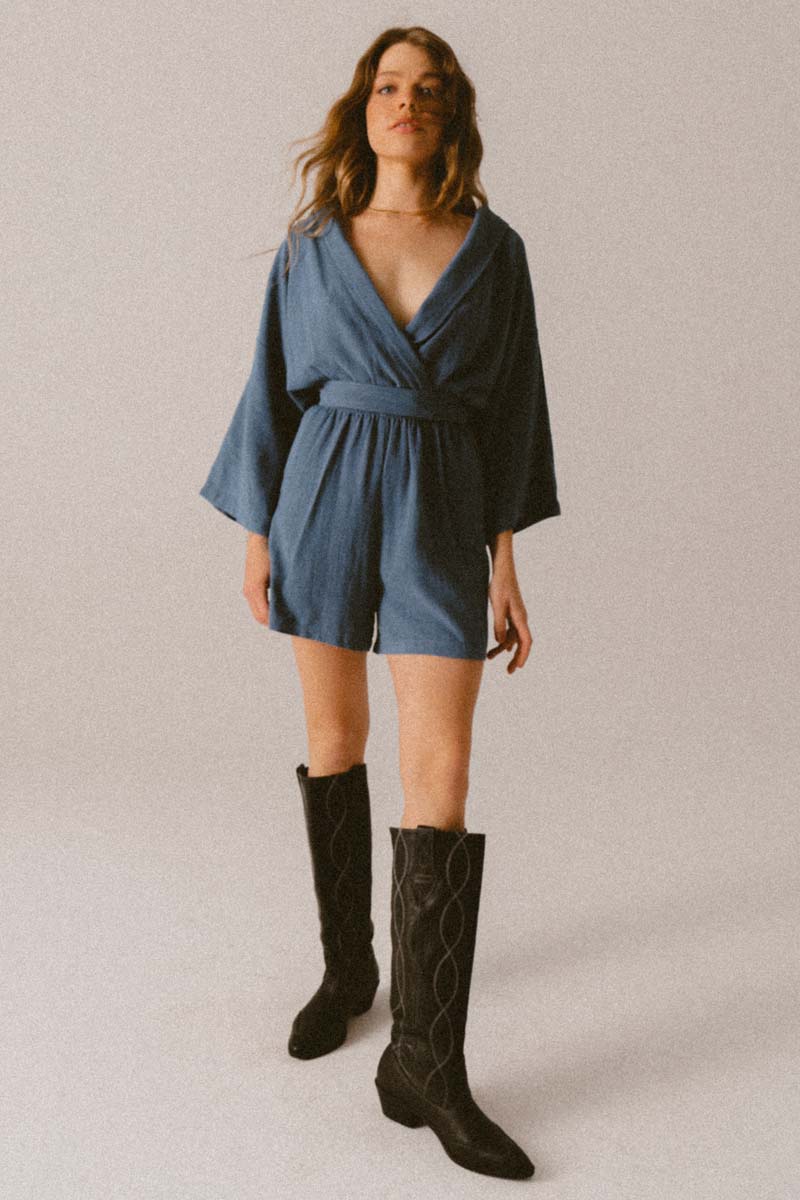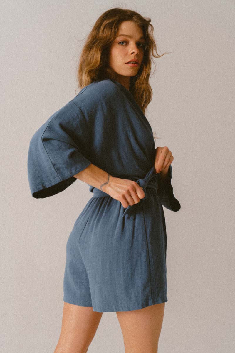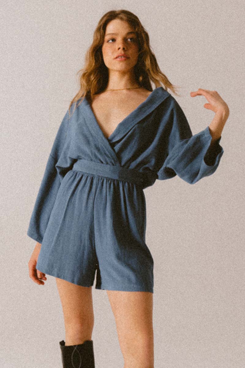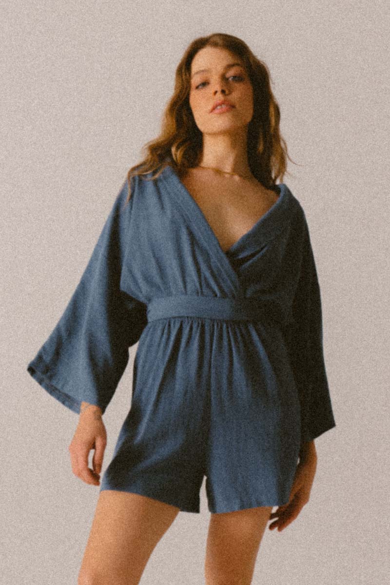 Materiał, z którego jest wykonany kombinezon jest niezwykle delikatny i miękki materiał z oryginalną teksturą. W pasie oprócz paska do kompletu, jest guma, która uwydatnia wcięcie w tali. Dekolt V oraz szerokie rękawy to idealny krój na lato.