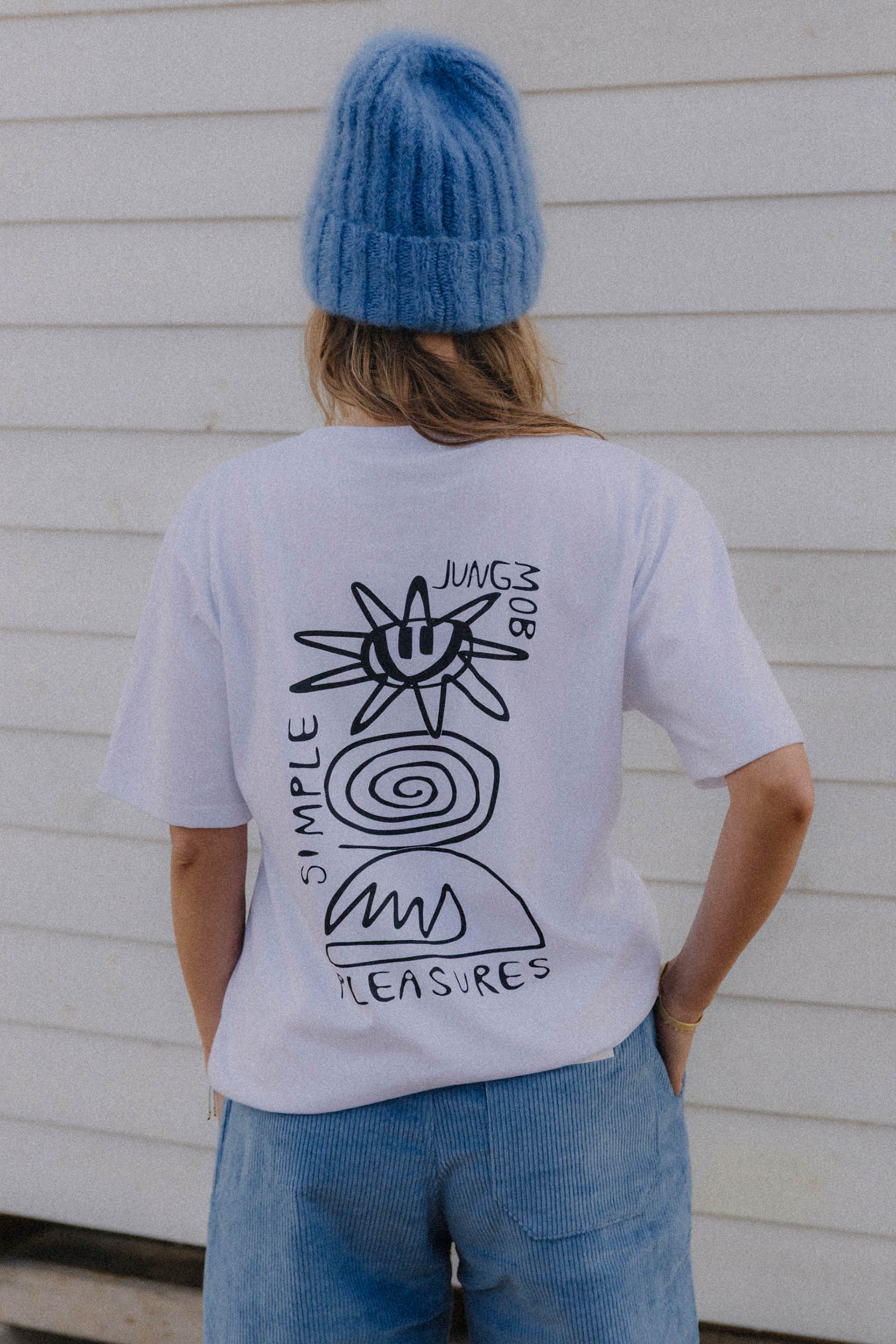 SIMPLE PLEASURES - zupełnie nowa grafika na sezon S/S 2025. Koszulka zaprojektowana przez Kasię naszą graficzkę. Simple pleasure - słoneczko, falka i czego chcieć więcej?;) Z przodu słoneczko wykonane metodą sitodruku, grafika z tyłu również. Prosiliście nas o trochę basiców i to jest nasza propozycja dla Was. Koszulka wykonana z wysokiej jakości bawełny o gramaturze 180.