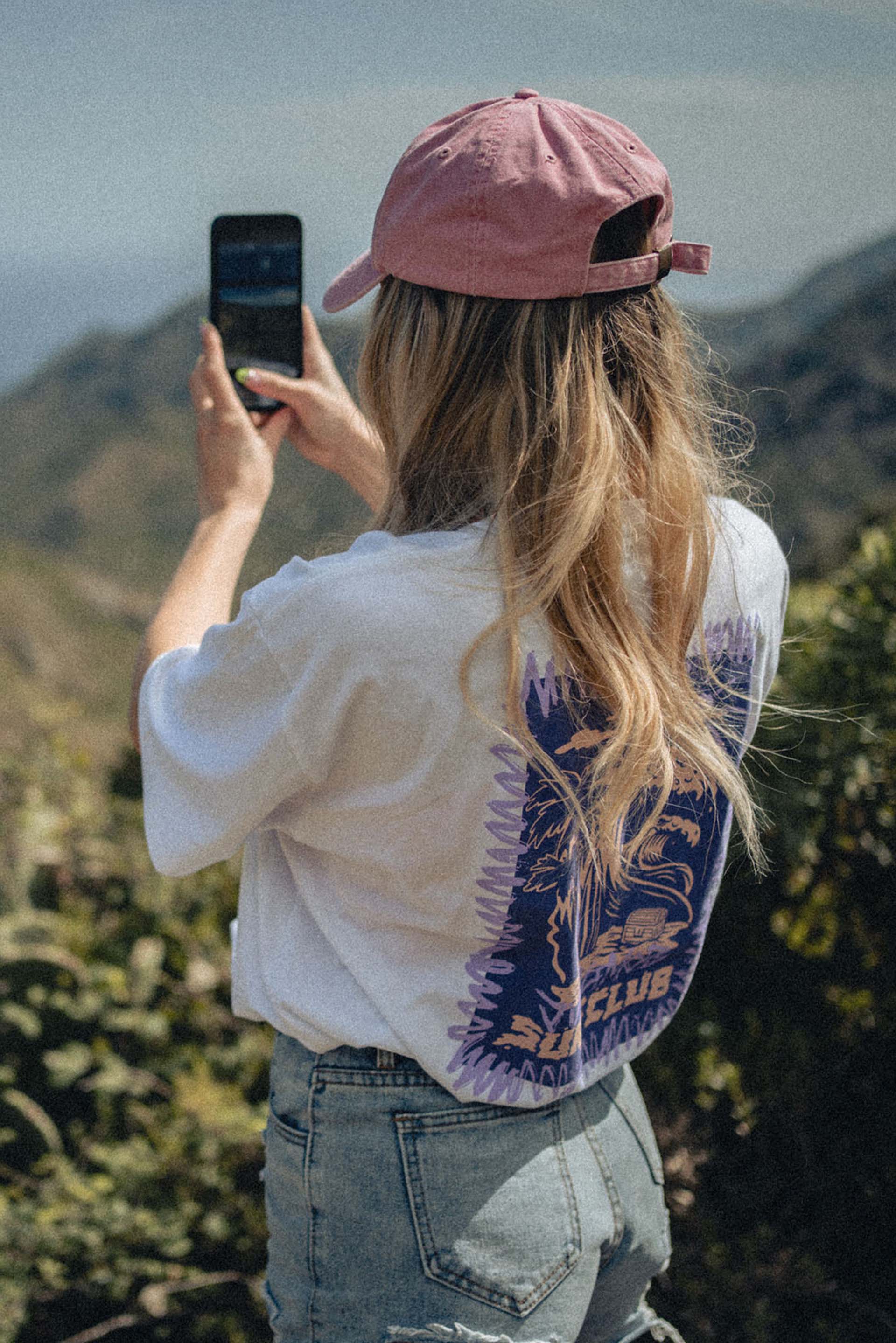 T-shirt to klasyk letnich stylizacji. Na plecach oraz na piersi druk w kolorze fioletowo kremowym. Dołącz do Jungmob Surf Club!