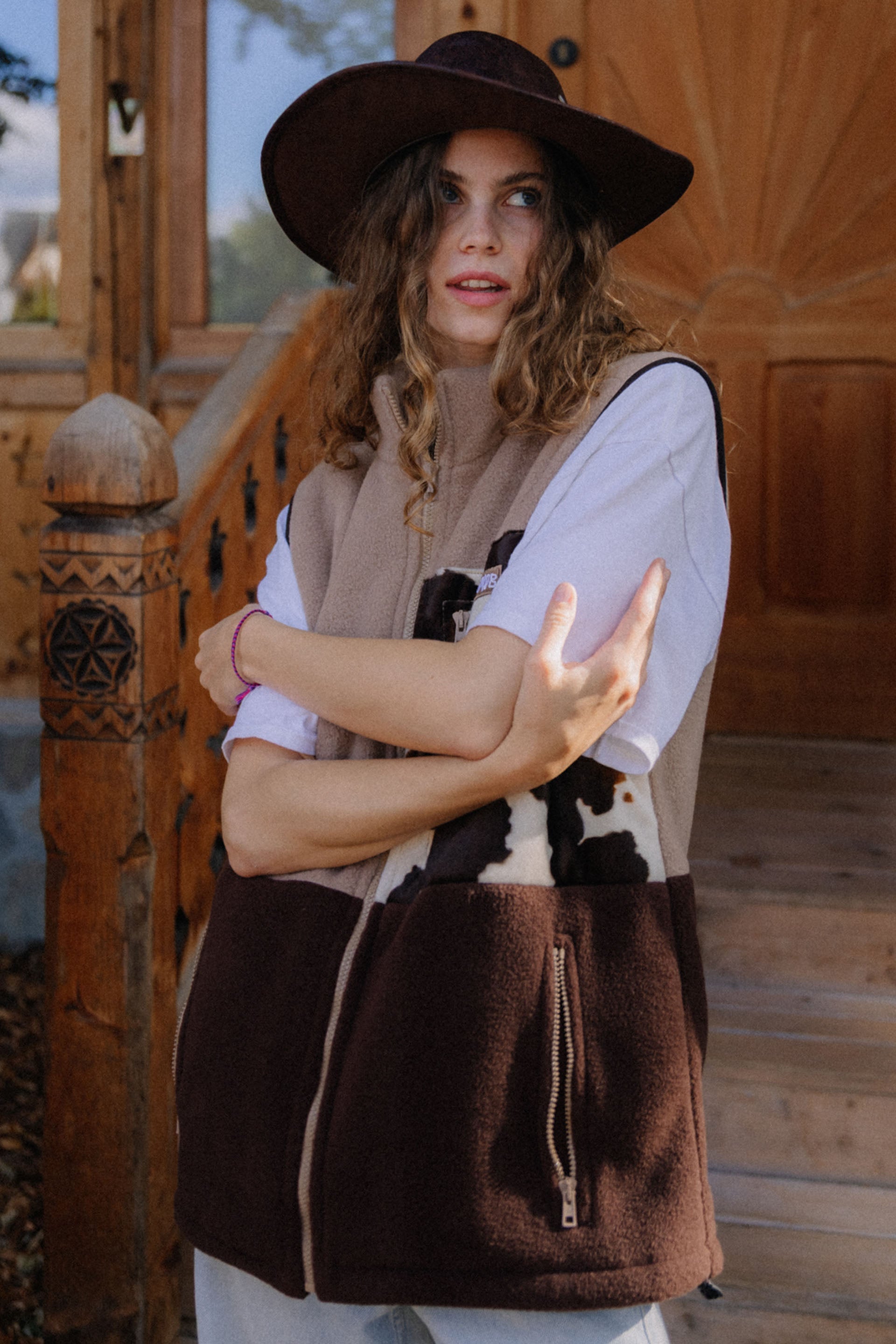ta kamizelka to propozycja dla osób, które lubią nietuzinkowe detale w połączeniu z neutralnymi odcieniami.. Połączenie ciepłych brązów z kieszenią w efektowny krowi wzór sprawia, że klasyczna kamizelka nabiera charakteru inspirowanego klimatem western i naturą. Miękki polar gwarantuje przyjemne otulenie i izolację od chłodu, a wszyta podszewka zwiększa komfort noszenia. Kamizelka daje pełną swobodę ruchów, więc doskonale sprawdzi się zarówno w codziennych stylizacjach, jak i podczas aktywności na świeżym powietrzu. Dwie boczne kieszenie zapinane na zamek oraz dodatkowa kieszeń na piersi pozwalają bezpiecznie przechowywać drobiazgi, a regulowany ściągacz u dołu chroni przed zimnym wiatrem.
