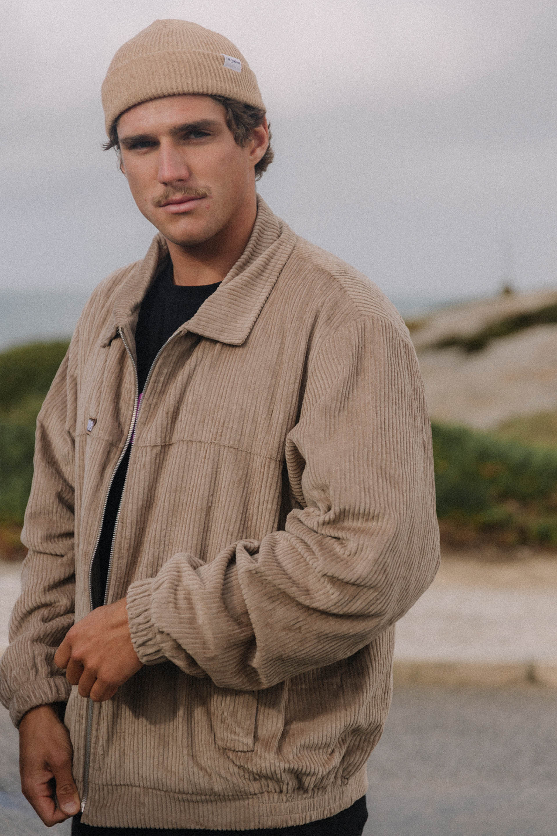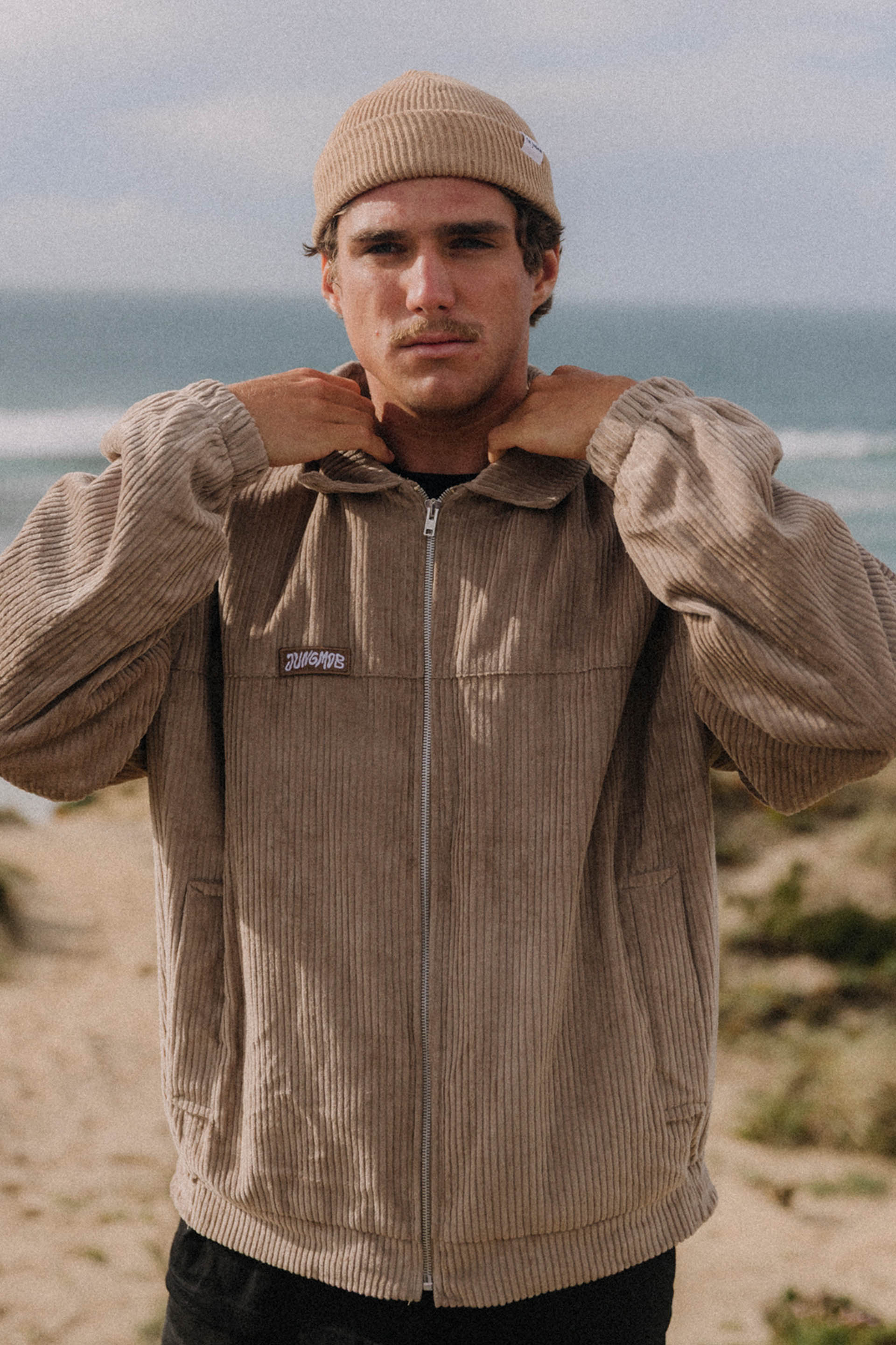 Kurtka sztruksowa RIDE BASEBALL FLAT WHITE - Luźna, oversizowa kurtka z beżowego sztruksu w kolorze piasku. Klasyczny krój z kołnierzem, elastyczne ściągacze w rękawach i na dole, dwie boczne kieszenie.