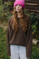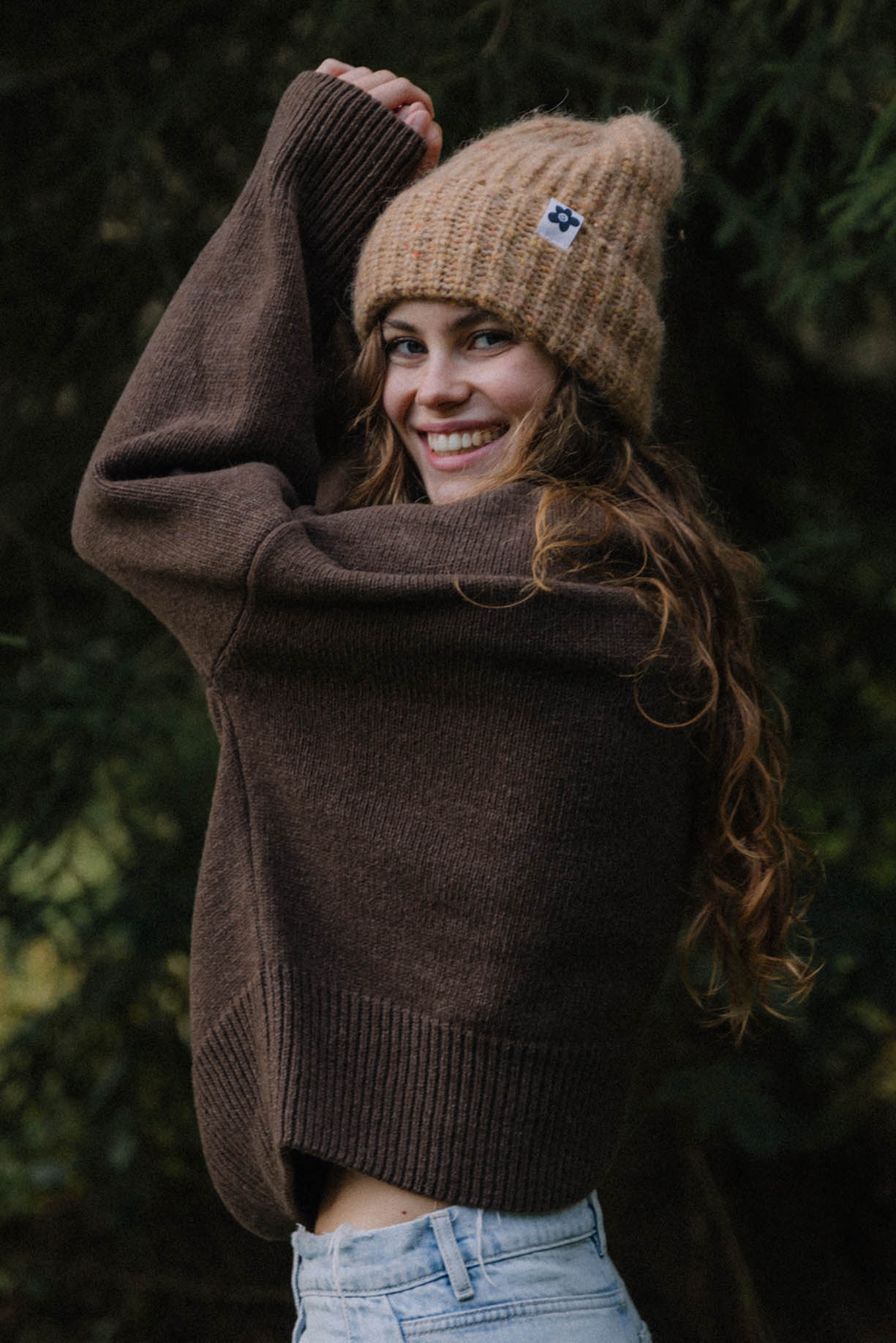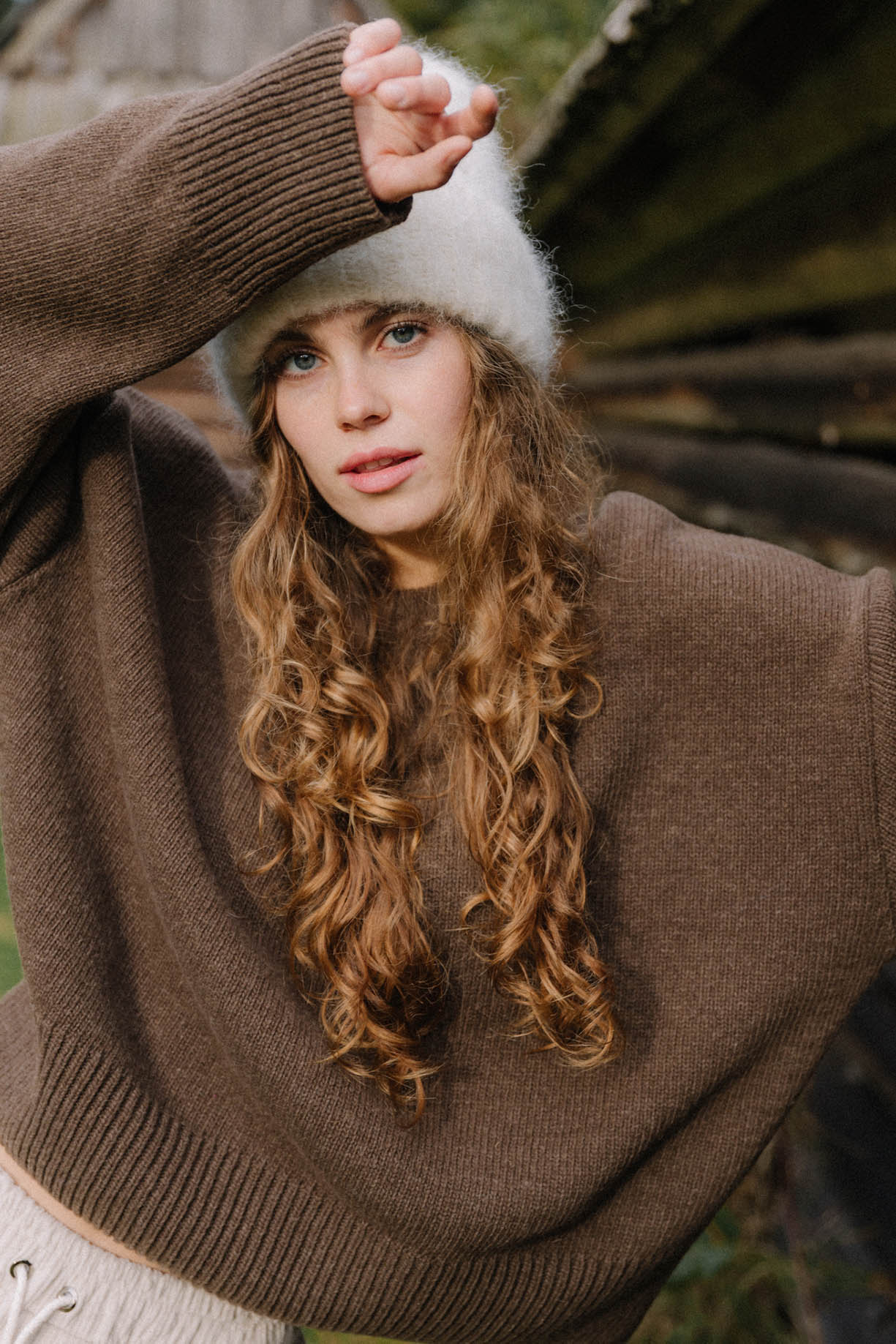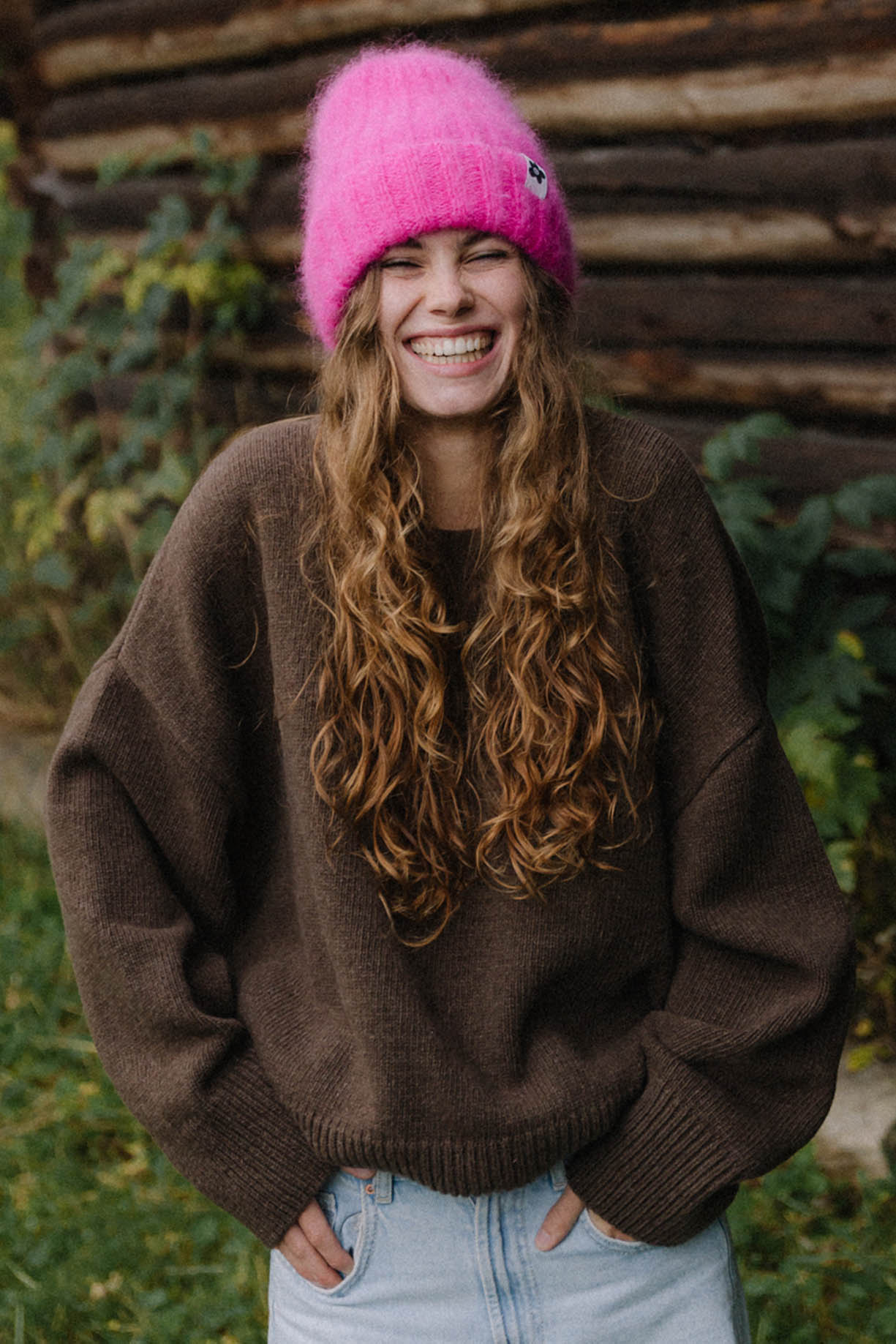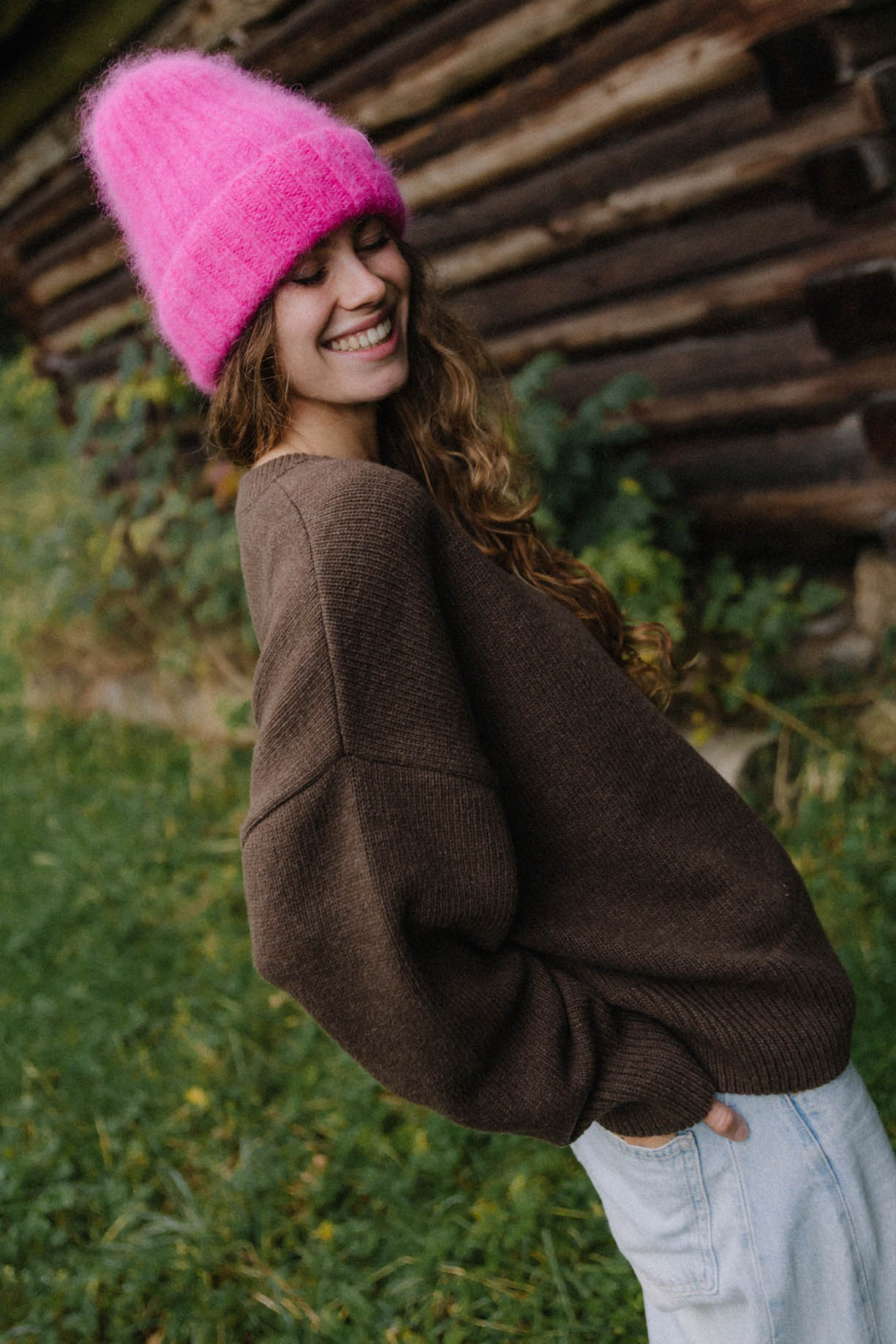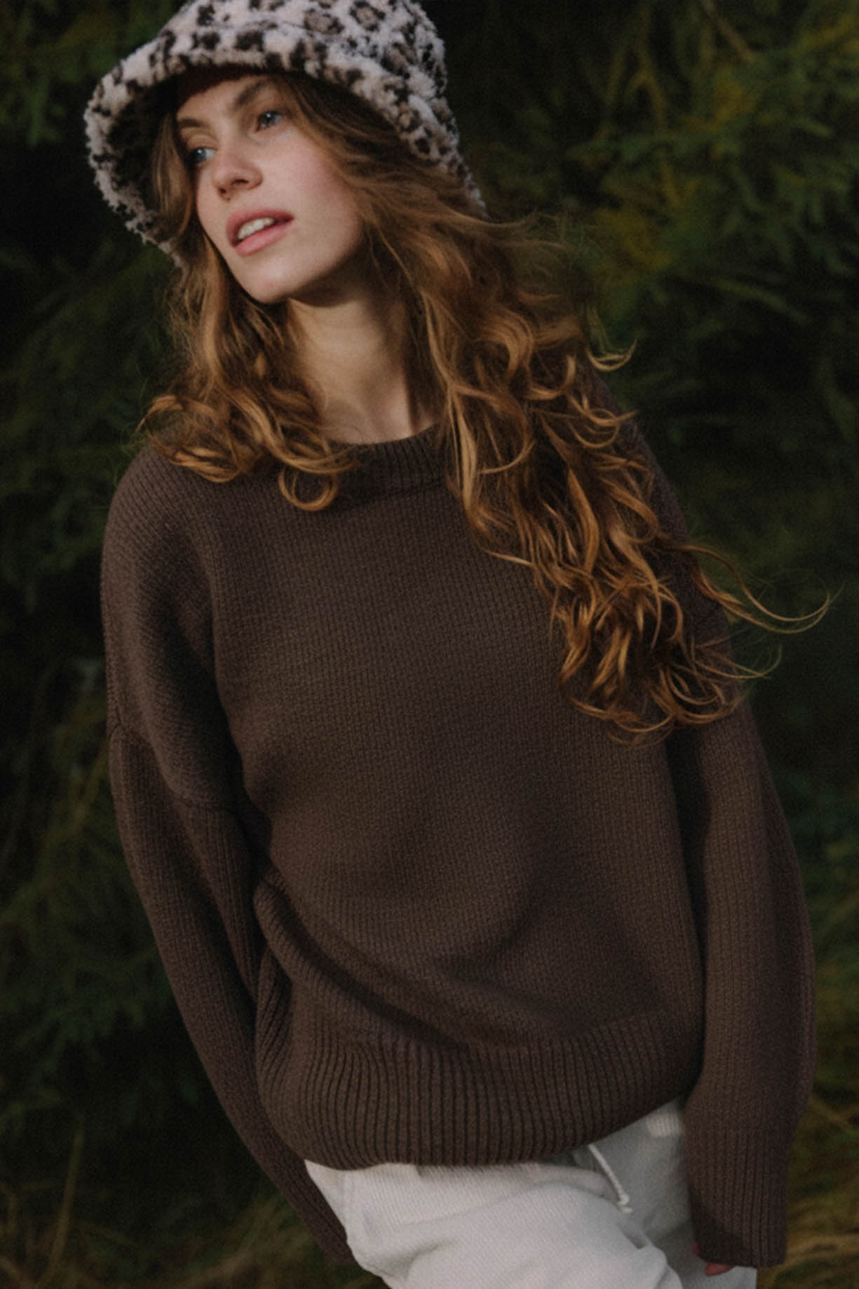 Wełniany sweter stworzony na chłodne dni, zarazem tak uniwersalny, że będziesz nosić go przez cały sezon! Połączenie naturalnej miękkości i minimalistycznego designu, który pasuje zarówno do miejskich stylizacji, jak i weekendowych spacerów za miasto. Wykonany z wysokiej jakości, przyjemnej w dotyku wełny, zapewnia komfort i ciepło bez zbędnej ciężkości. Delikatny, gęsty splot sprawia, że sweter świetnie układa się na sylwetce, a lekko oversize’owy krój daje swobodę ruchów i dodaje mu nowoczesnego charakteru. Dopracowane detale – szerszy ściągacz u dołu i na rękawach oraz subtelnie wykończony dekolt – nadają mu estetyczną, naturalną elegancję. Głęboki, ziemisty odcień brązu idealnie współgra z jasnymi spodniami, denimem i ulubionymi jesiennymi dodatkami. Ciepły. Stylowy. Niezwykle wygodny. To sweter, który otuli Cię w każdy chłodny poranek i doda klasy w codziennych stylizacjach. Idealny wybór na sezon jesienno-zimowy.