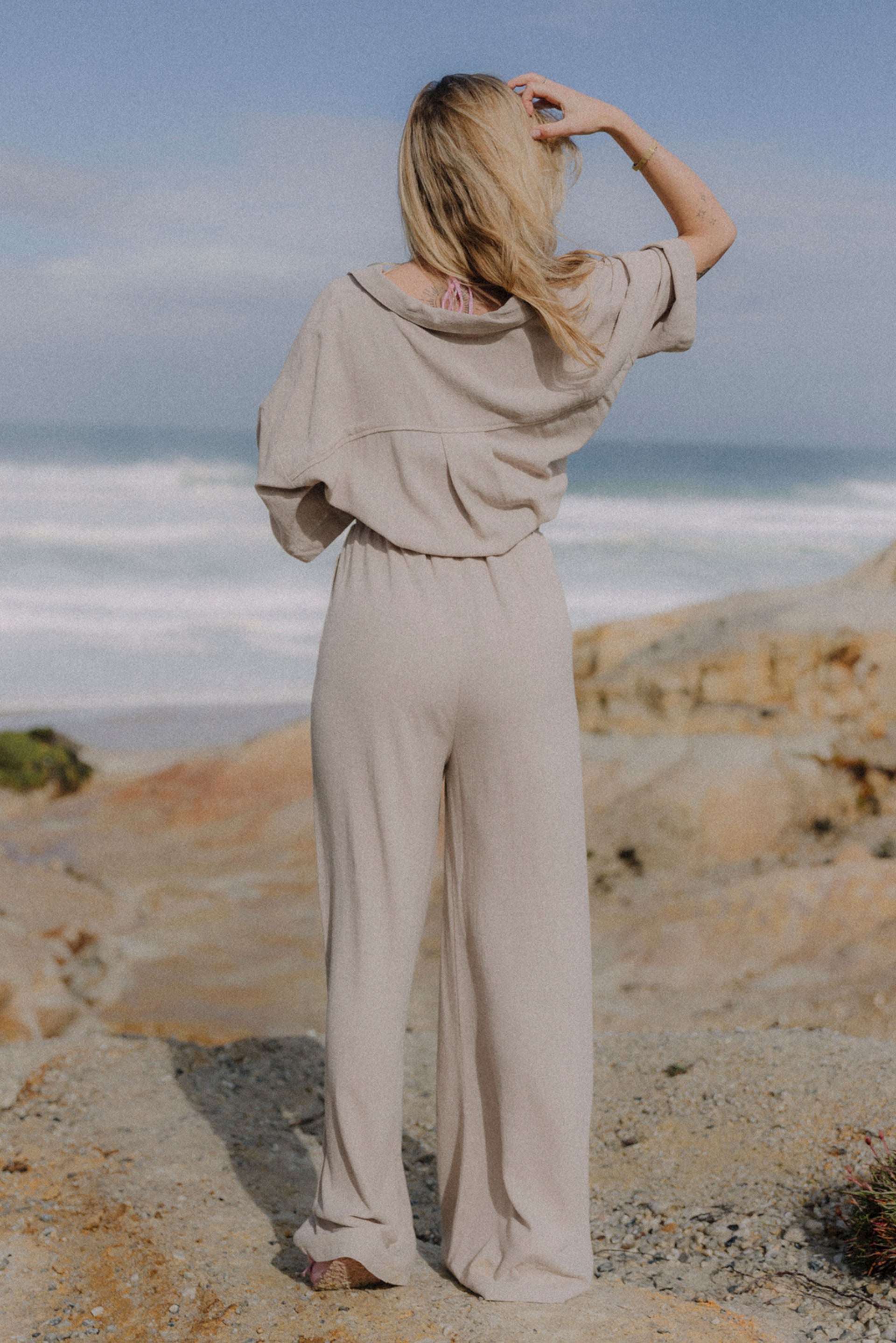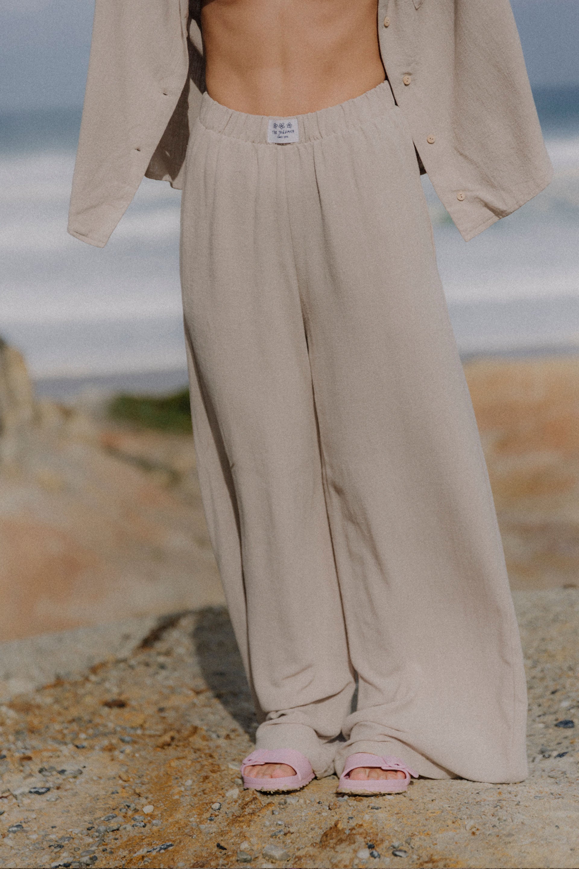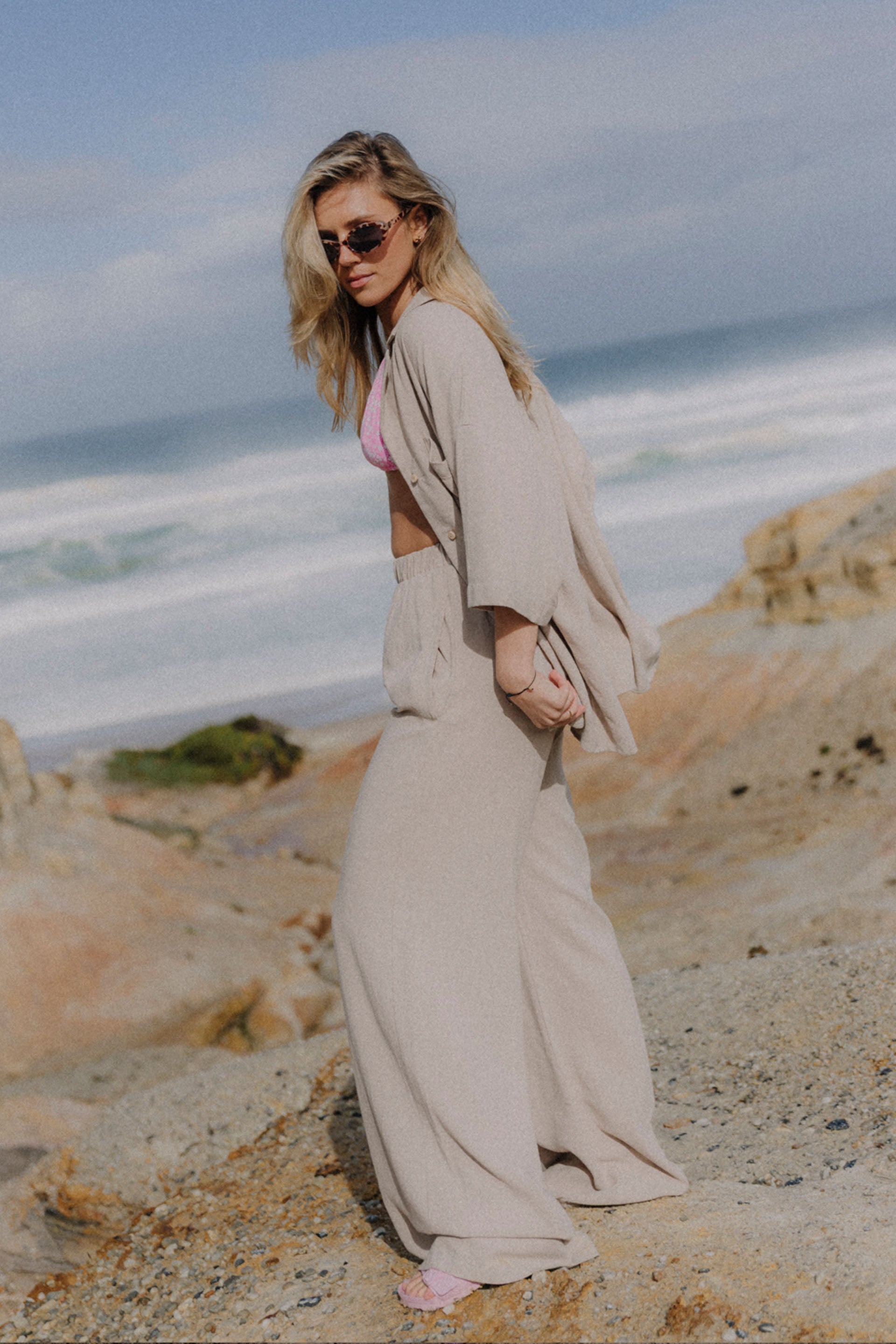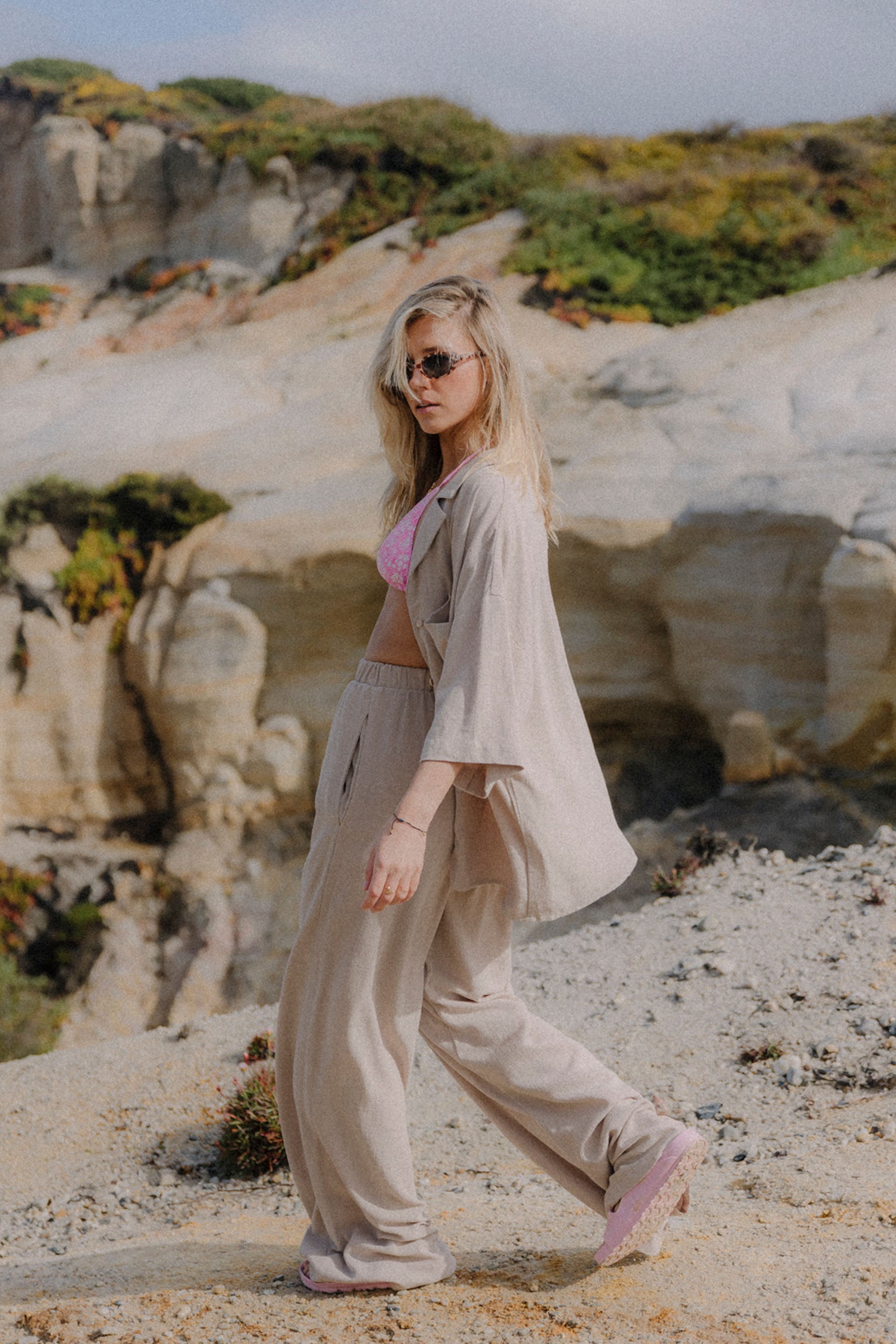 Wykonane z wiskozy z dodatkiem lnu, w pięknym piaskowym kolorze.Doskonałe zarówno na wieczorne wyjścia, jak i na casualowe okazje.