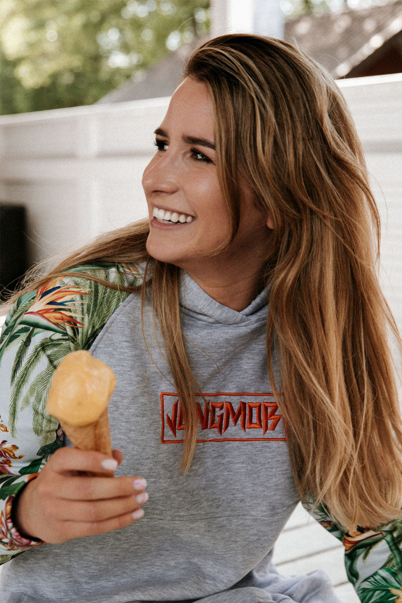 Klasyczna szarość przełamana kolorowymi rękawami i pięknym pomarańczowym haftem czyli PAPAYA JUNGLE LONG. Przedłużana bluza to idealna opcja na lato, nasz propozycja to połączenie z krótkimi spodenkami lub leginsami w tym samym princie. Świetnie sprawdzi się też noszona jako sukienka.