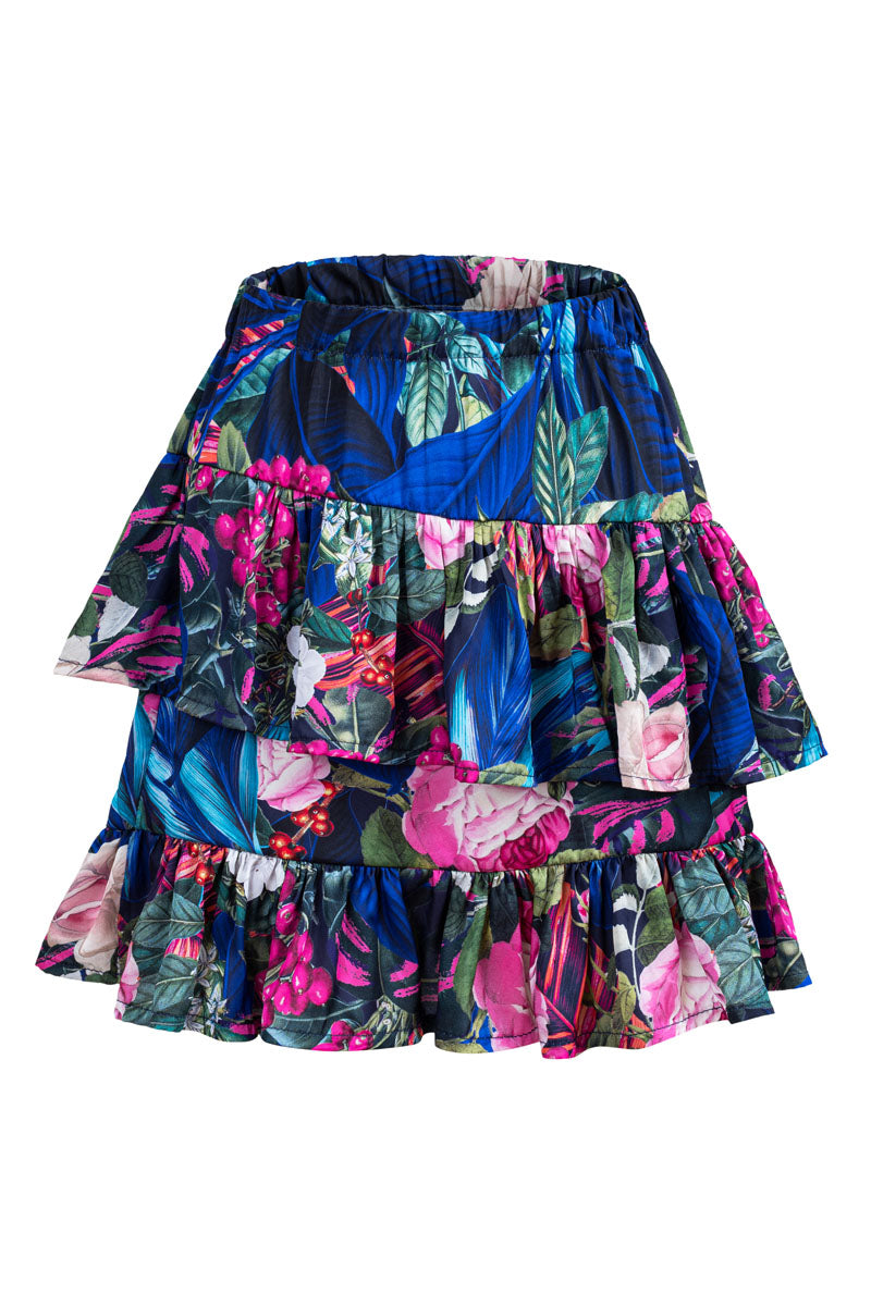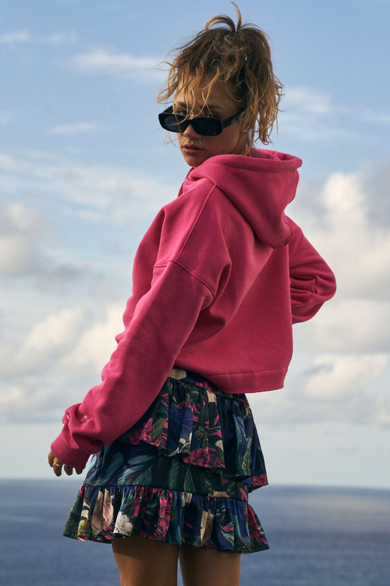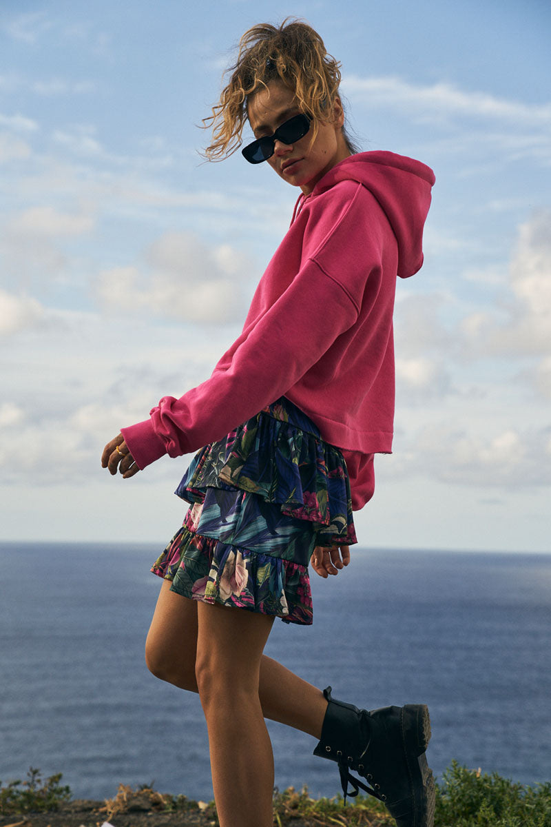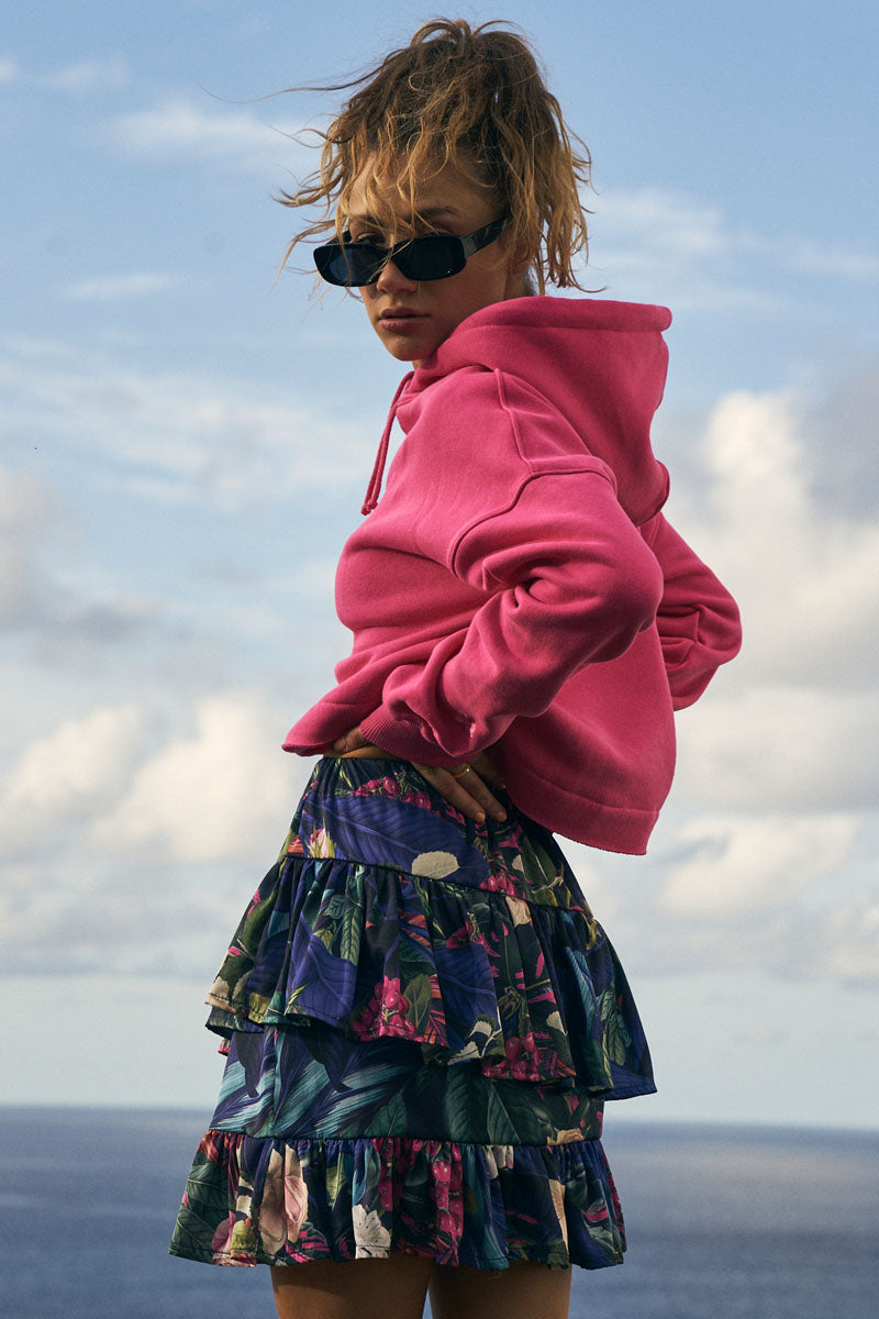 HOLA to wersja spódniczki z dwoma falbankami. Krótka i zwiewna - pięknie podkreśla nogi. Wzór ROWANBERRY PINK to najlepszy wybór na plaże ale i imprezę - do mocniejszych stylizacji.