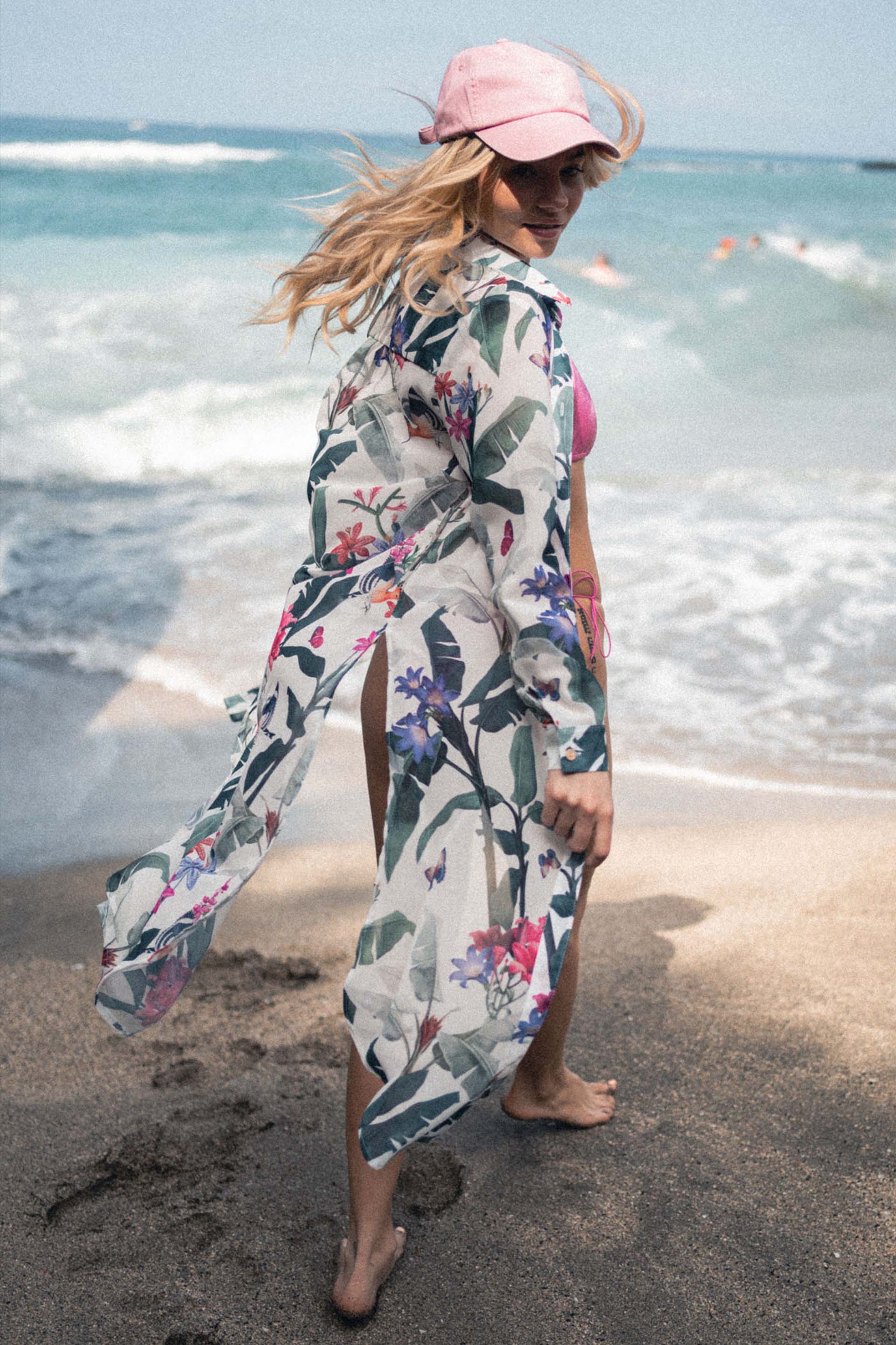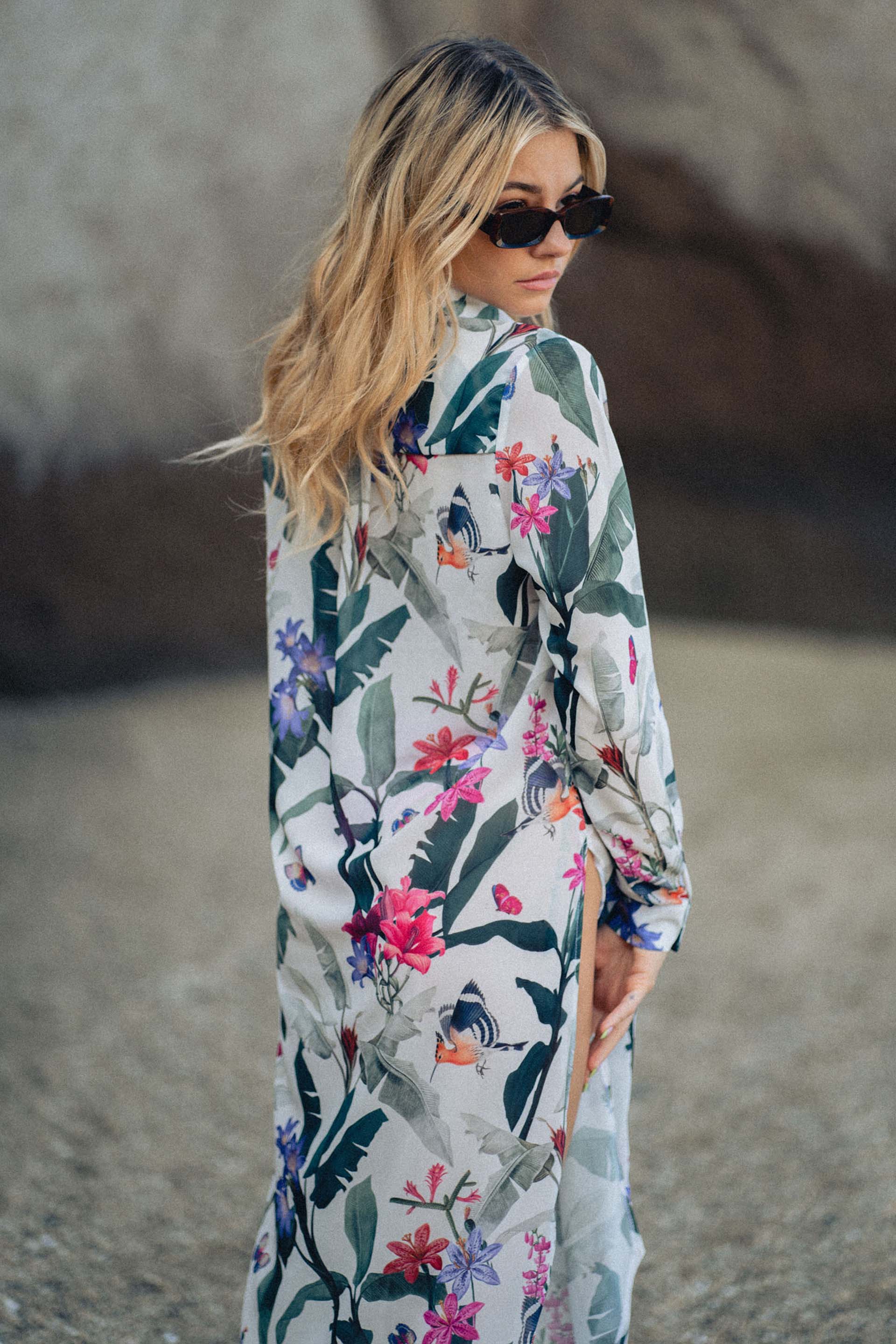 Delikatny błękit BUTTERFLY HOUSE WHITE na zwiewnej koszuli. Wakacyjny wypad lub elegancka kolacja? Koszula sprawdzi się podczas każdej okazji!
