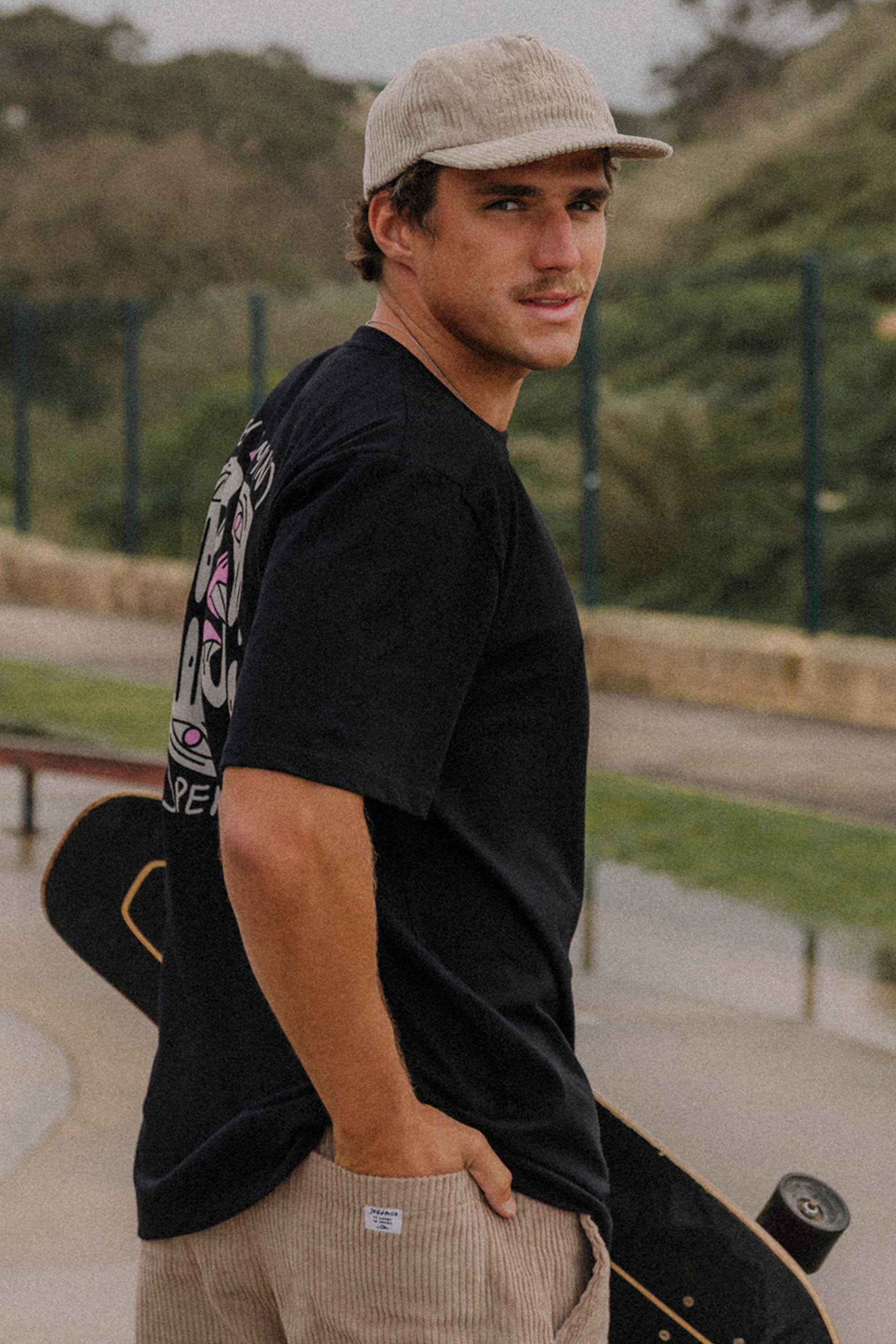 OPEN MIND - klasyczna czarna koszulka z mega grafiką na plecach zaprojektowaną przez Krzyśka. Z tyłu wykonana metodą wywabu, z przodu napis "open mind".