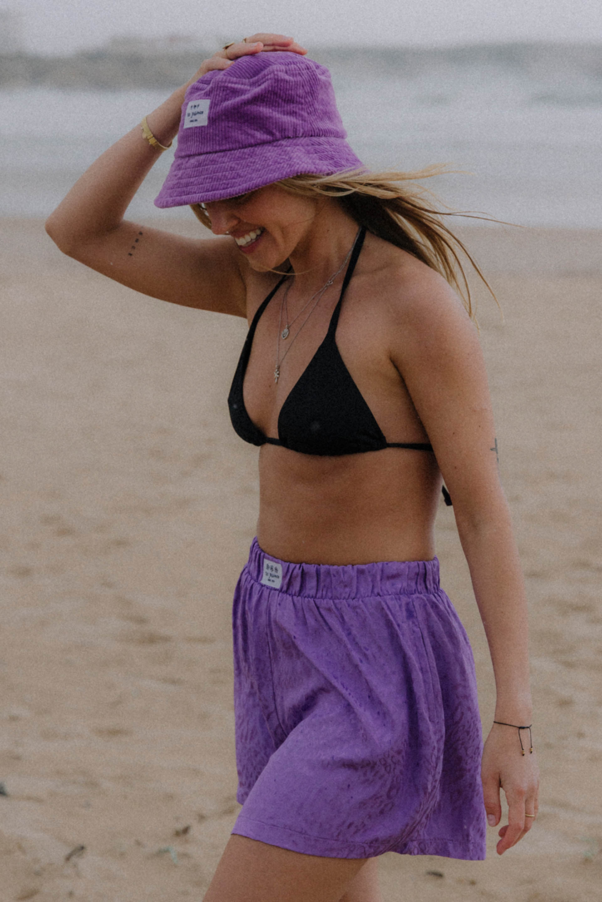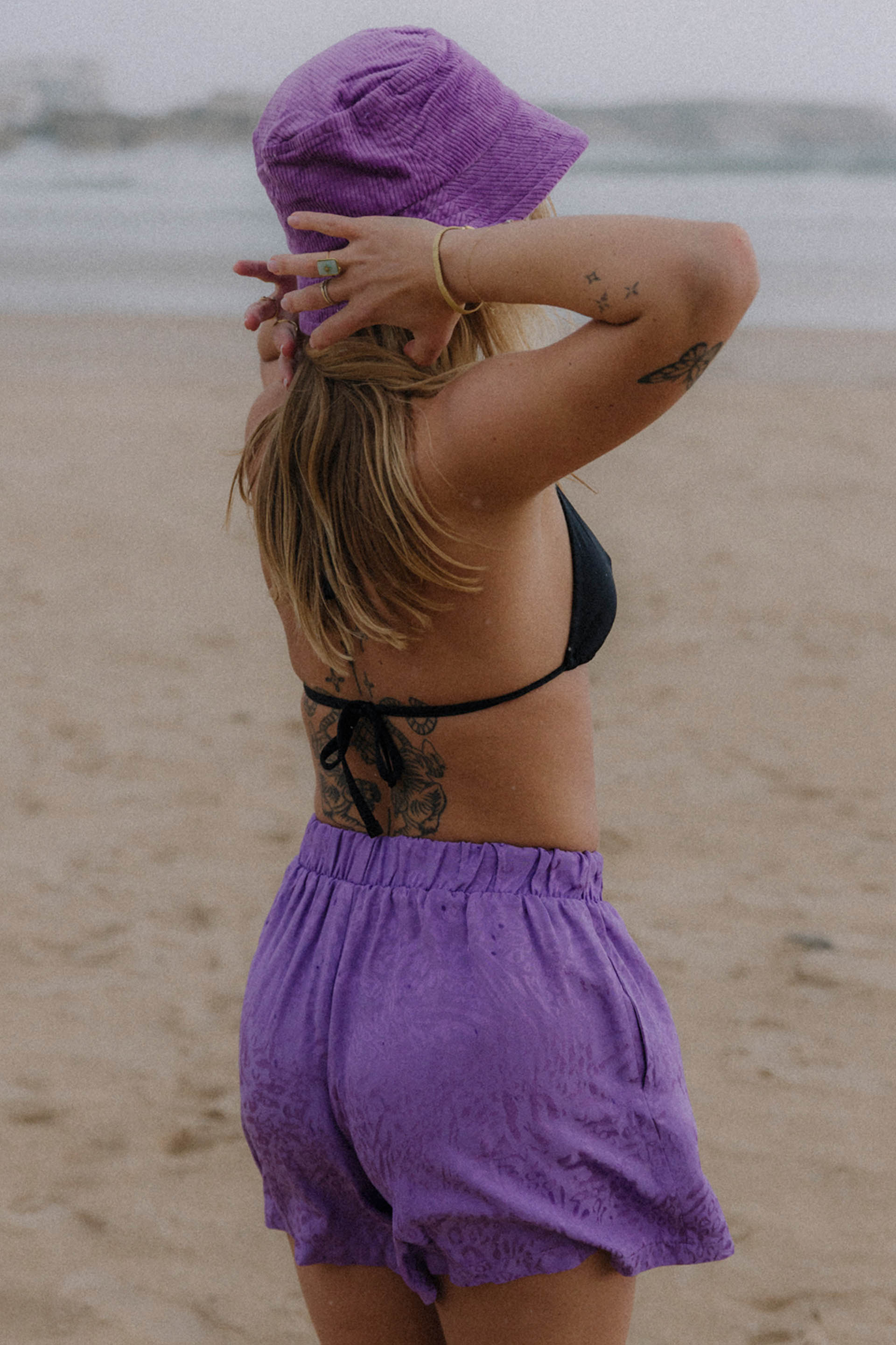 SPODENKI FUNKY LAVENDER PANTHER - to nowość w naszej kolekcji s/s 2025. Szorty są w uszyte w pięknym fioletowym odcieniu, we wzór panterki , który mieni się na słońcu.
