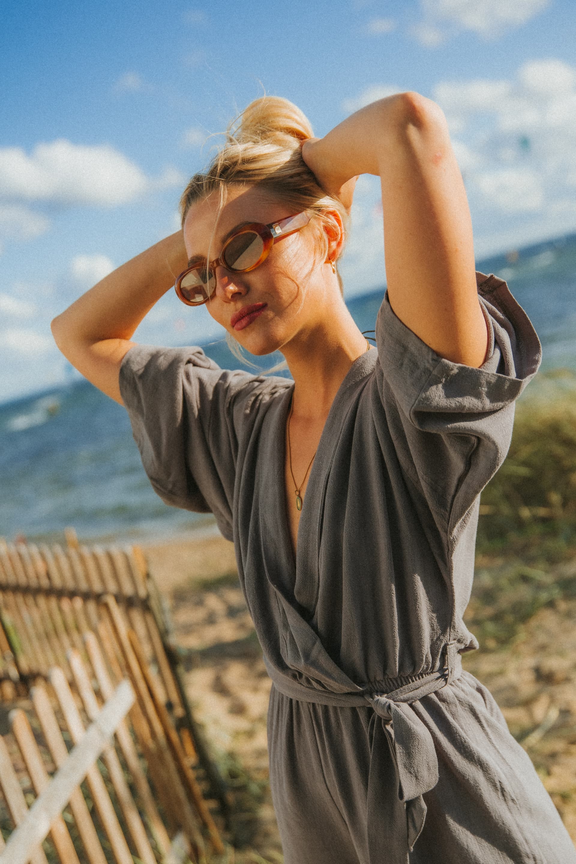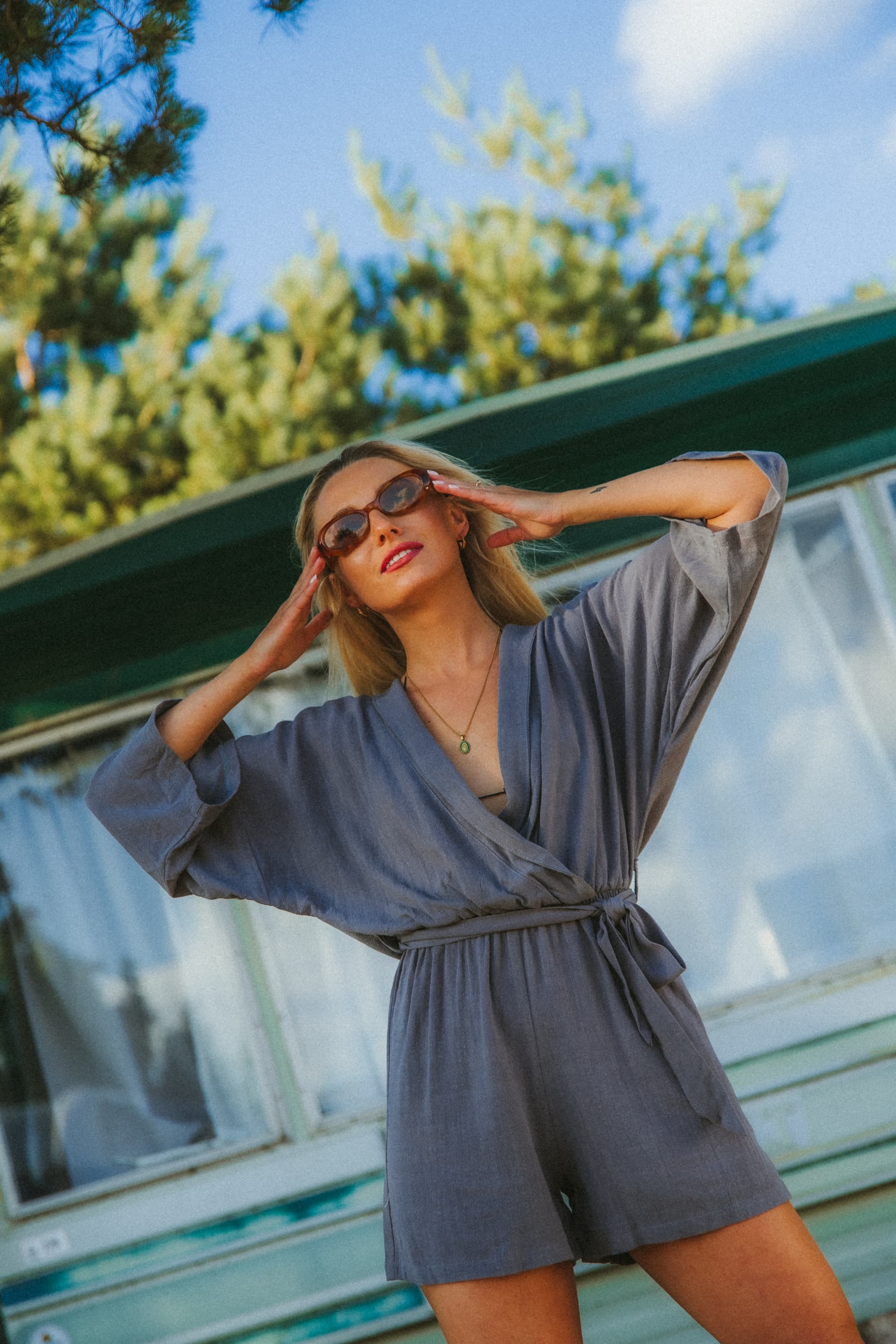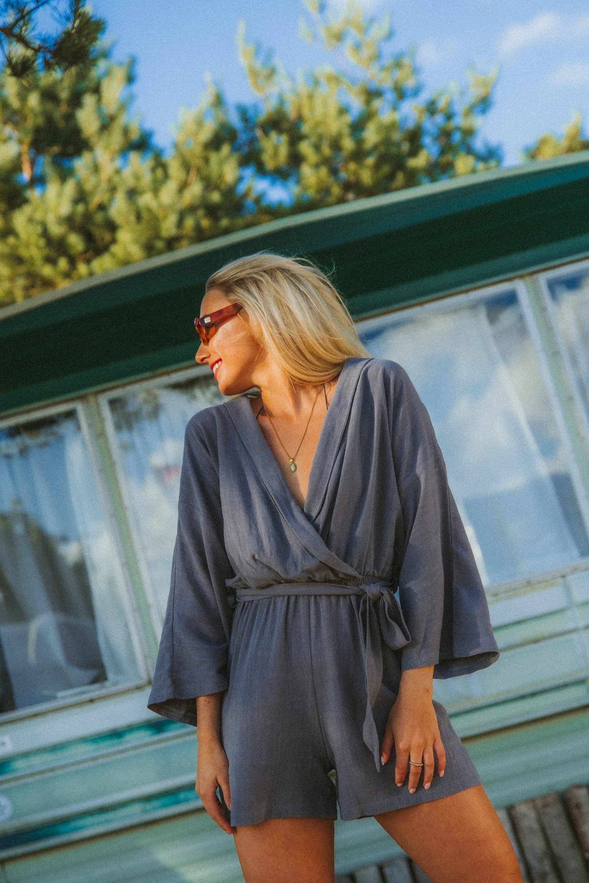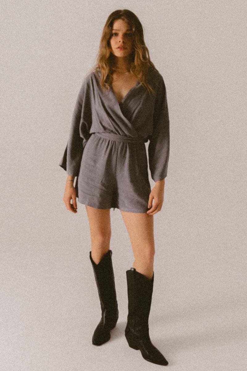 The fabric of the jumpsuit is incredibly delicate and soft with an original texture. In the waist, besides the matching belt, there is elastic that accentuates the waistline. The V-neck and wide sleeves make it an ideal cut for summer.