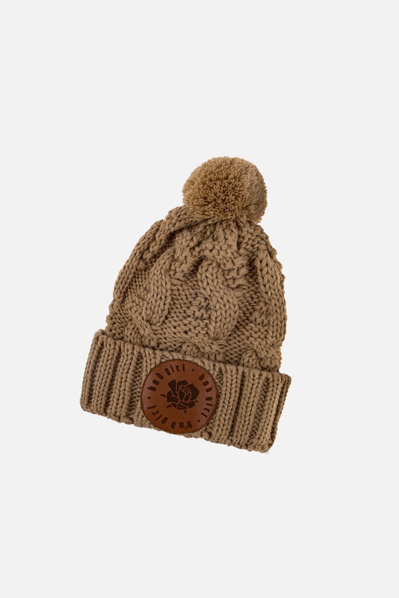 Very warm, knitted hat with pompom in child version. Perfect for the autumn-winter season. On the front rose badge.