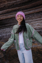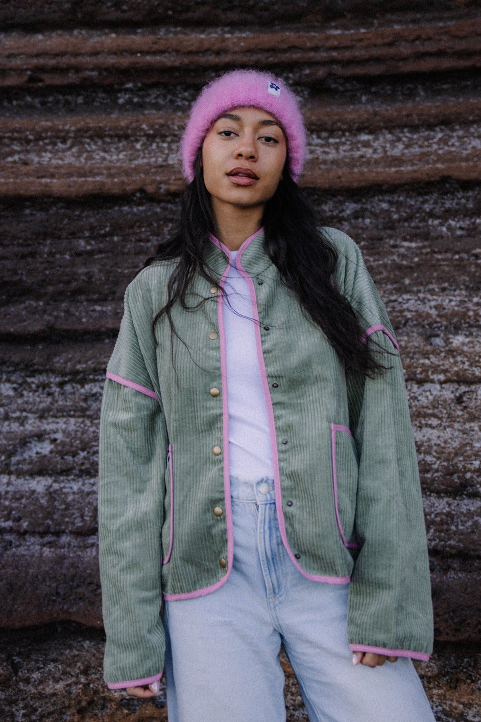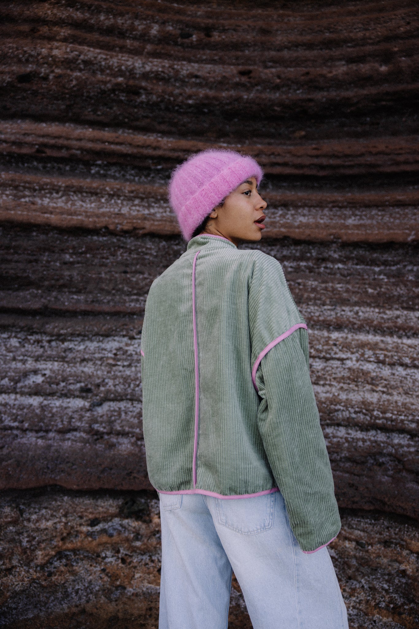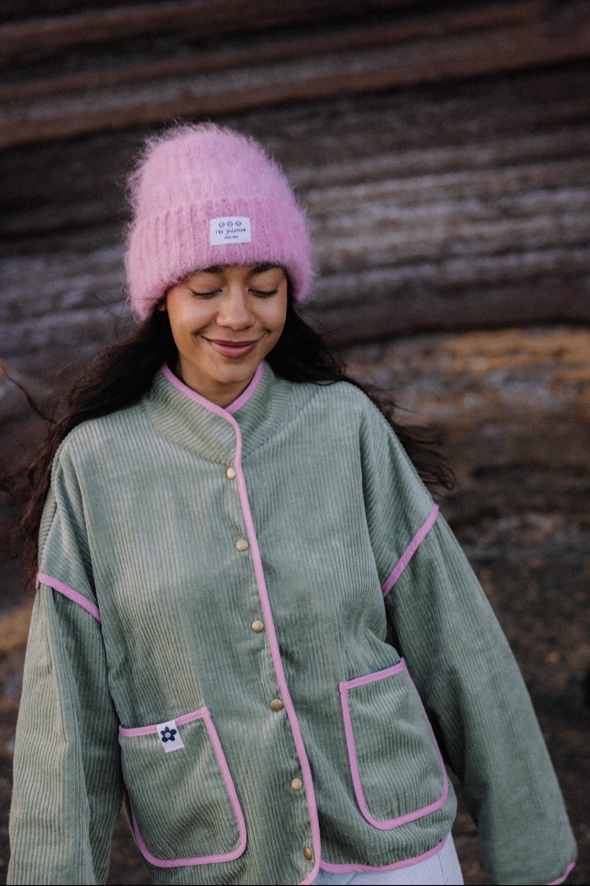 Wiosenna kurtka PRAIA OLIVE, która łączy vintage vibe z surferskim luzem. Gotowa na każdą zmianę planów. Uszyta z oliwkowego sztruksu, a kontrastowe różowe detale przełamują całość, dodając lekkości i swobody, przywołując nutę nostalgii i skojarzenia z nadmorskim klimatem i słońcem odbijającym się od fal. Oversize’owy krój zapewnia wygodę i swobodę ruchów, a dopracowane wykończenia sprawiają, że kurtka wygląda dobrze niezależnie od okazji. Napy na całej długości, pojemne kieszenie i miękka, zielona podszewka dbają o funkcjonalność na co dzień. Subtelne akcenty – logo z charakterystyczny kwiatuszek – dopełniają całość, nadając jej indywidualnego stylu. To kurtka, która odnajdzie się wszędzie – od miejskich spacerów po spontaniczne wyjazdy tam, gdzie kończy się asfalt.