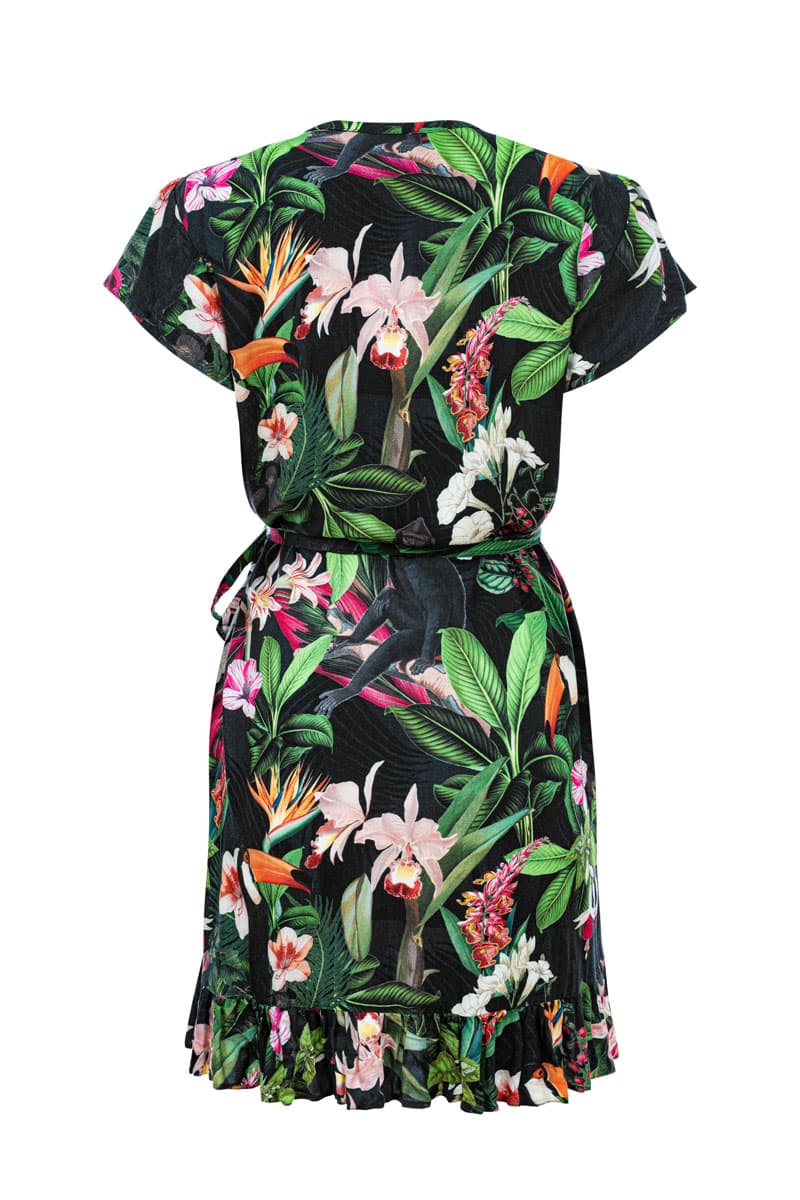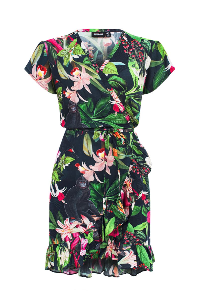 Print DARK MONKEY na zwiewnej sukience z falbankami COCO. Lekka, lejąca się, dzięki czemu idealnie nadaje się na plaże oraz wakacyjne imprezy.